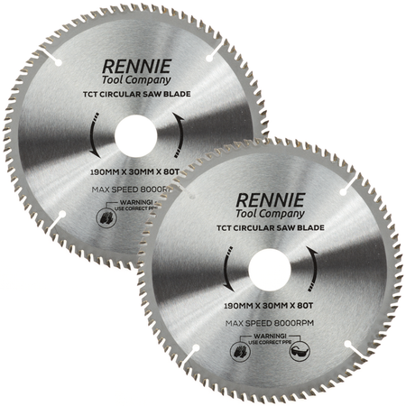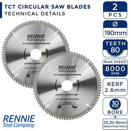 - Pack of 2 x 190mm x 80 teeth saw blades These have a 30mm bore so will fit any saw that has a 30mm bore. These circular saw blades also comes with a 25mm Bore, 20mm Bore and 16mm Bore reduction rings so these blades will also fit any circular saw that has a 25mm, 20mm or 16mm bore.