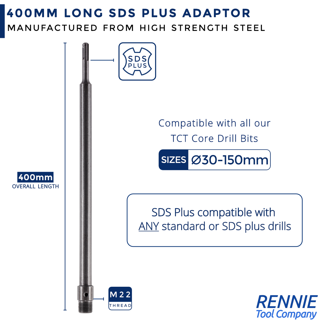 Our M22 Thread SDS Plus TCT Core Drill Adapters are engineered to provide exceptional performance and versatility for core drilling applications. Designed to fit standard SDS & SDS Plus chuck systems, these high-quality adapters and extension bars allow you to extend the reach of your core drill while ensuring a secure and reliable connection. Manufactured from durable materials, the TCT (Tungsten Carbide Tipped) design ensures a longer lifespan and improved drilling efficiency. Whether you're working with concrete, brick, or masonry, these adapters and extension bars are the perfect solution for your heavy-duty drilling needs.