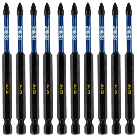- 10 piece Rennie Tool Company Magnetic PH1 impact driver bits set. These Phillips No.1 impact driver drill bits are 100mm (4") overall length. They are supplied in a plastic storage case. Manufactured using high quality S2 steel and using the latest manufacturing technologies.