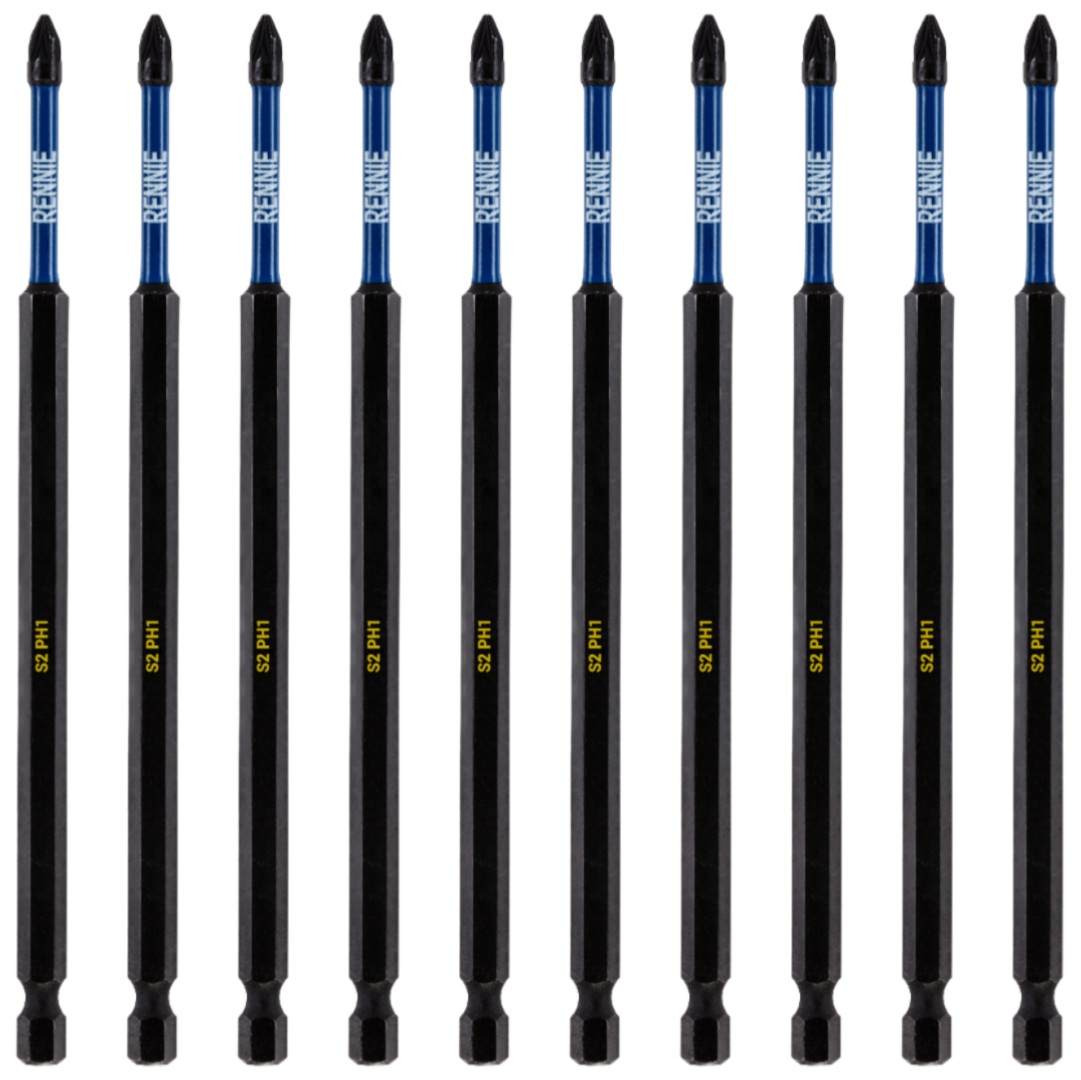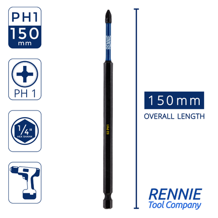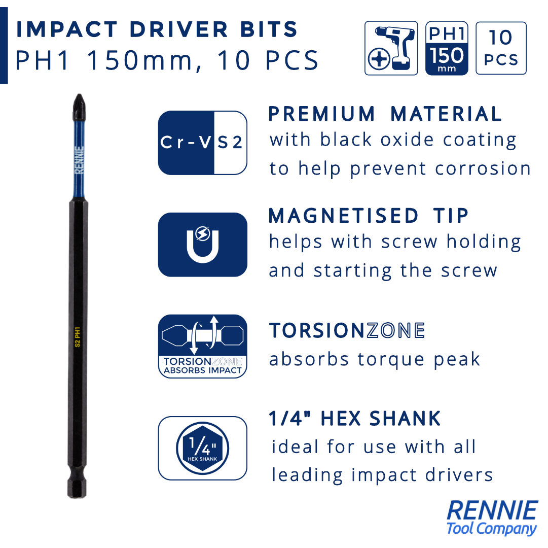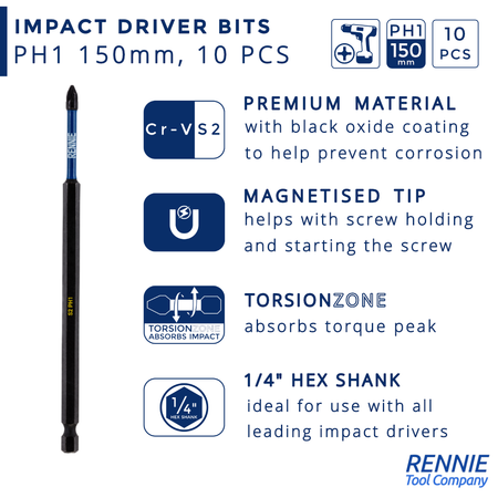 - 10 piece Rennie Tool Company Magnetic PH1 impact driver bits set.. These Phillips No.1 impact driver drill bits are 150mm (6") overall length. They are supplied in a plastic storage case. Manufactured using high quality S2 steel and using the latest manufacturing technologies.