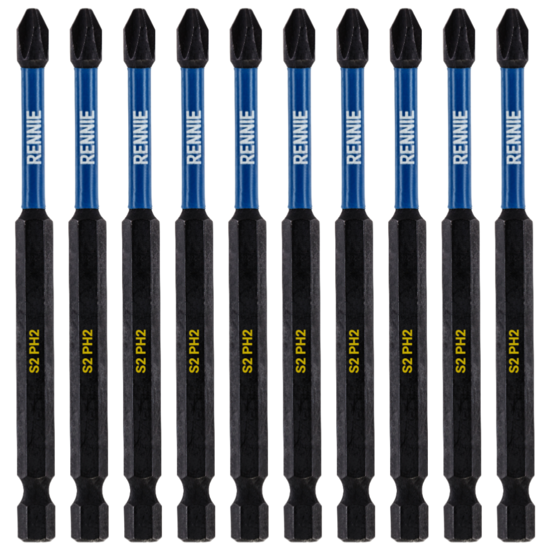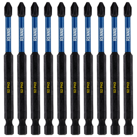 - 10 piece Rennie Tool Company magnetic PH2 impact driver bits set.. These Phillips No.2 impact driver drill bits are 100mm (4") overall length. They are supplied in a plastic storage case. Manufactured using high quality S2 steel and using the latest manufacturing technologies.
