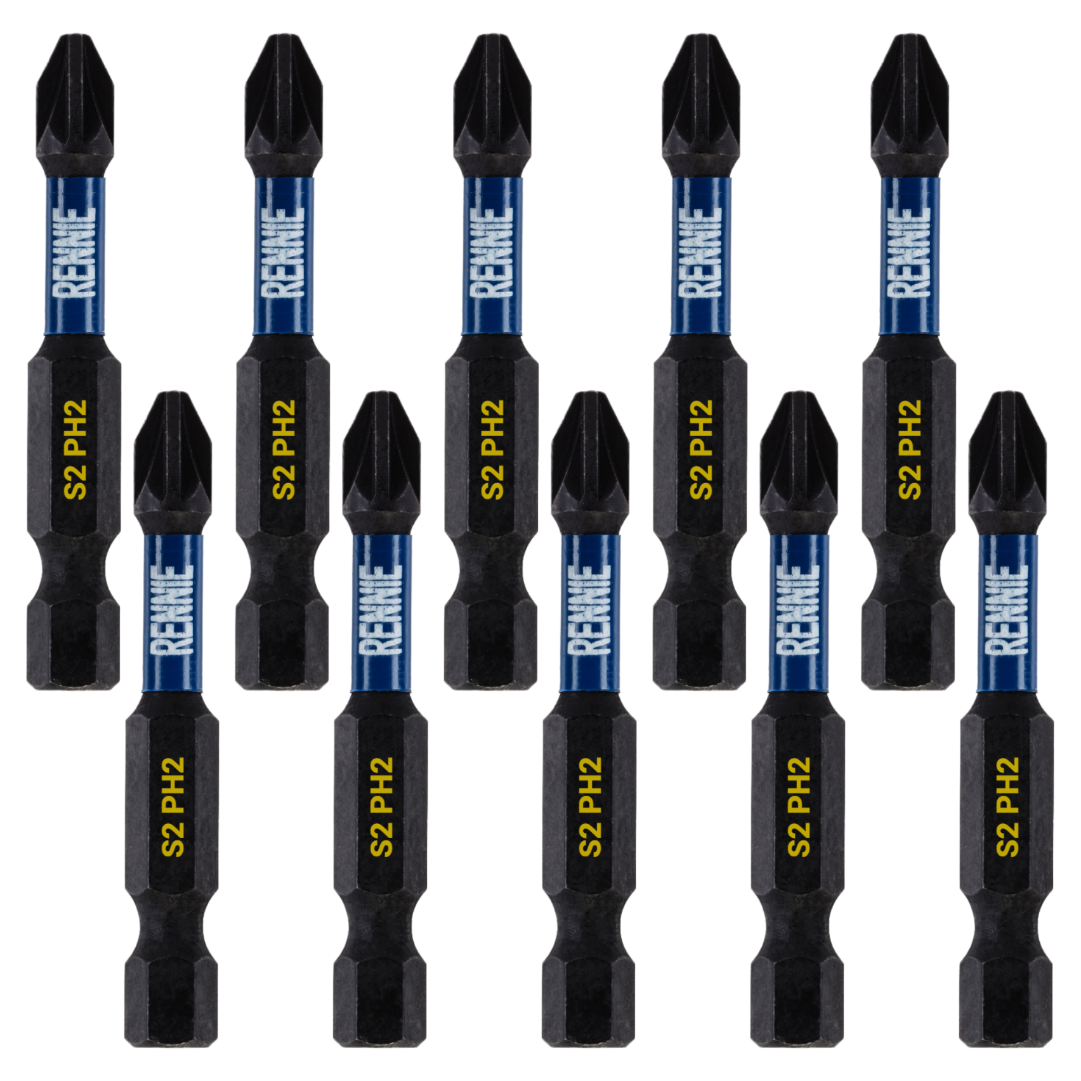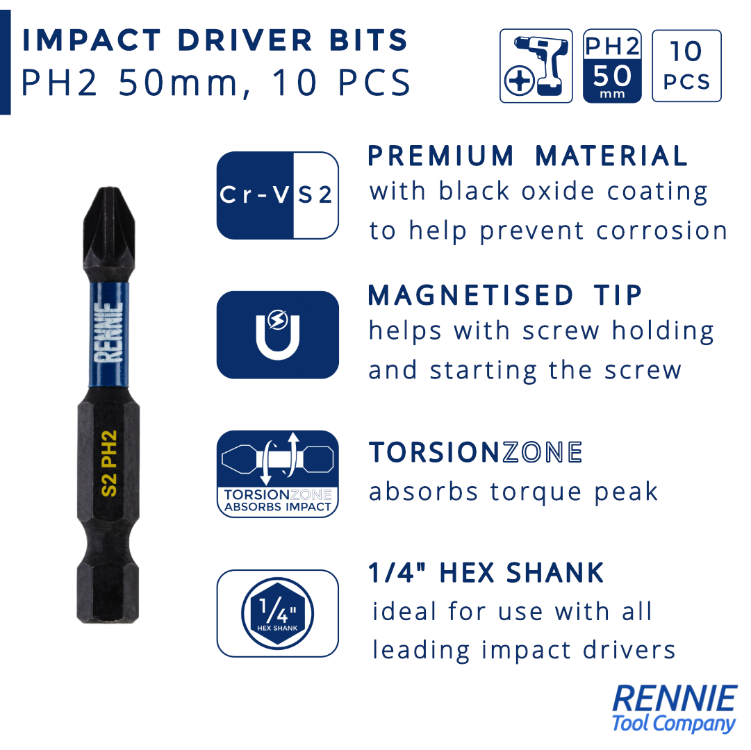 - 10 piece Rennie Tool Company magnetic PH2 impact driver bits set.. These Phillips No.2 impact driver drill bits are 50mm (2") overall length. They are supplied in a plastic storage case. Manufactured using high quality S2 steel and using the latest manufacturing technologies.