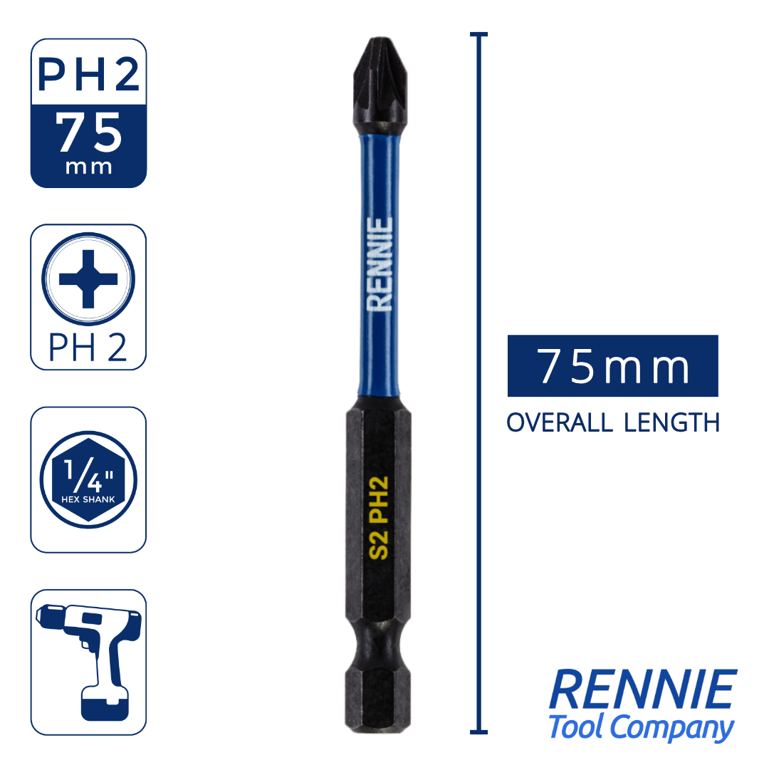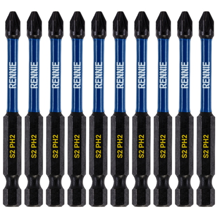 - 10 piece Rennie Tool Company magnetic PH2 impact driver bits set.. These Phillips No.2 impact driver drill bits are 75mm (3") overall length. They are supplied in a plastic storage case. Manufactured using high quality S2 steel and using the latest manufacturing technologies.