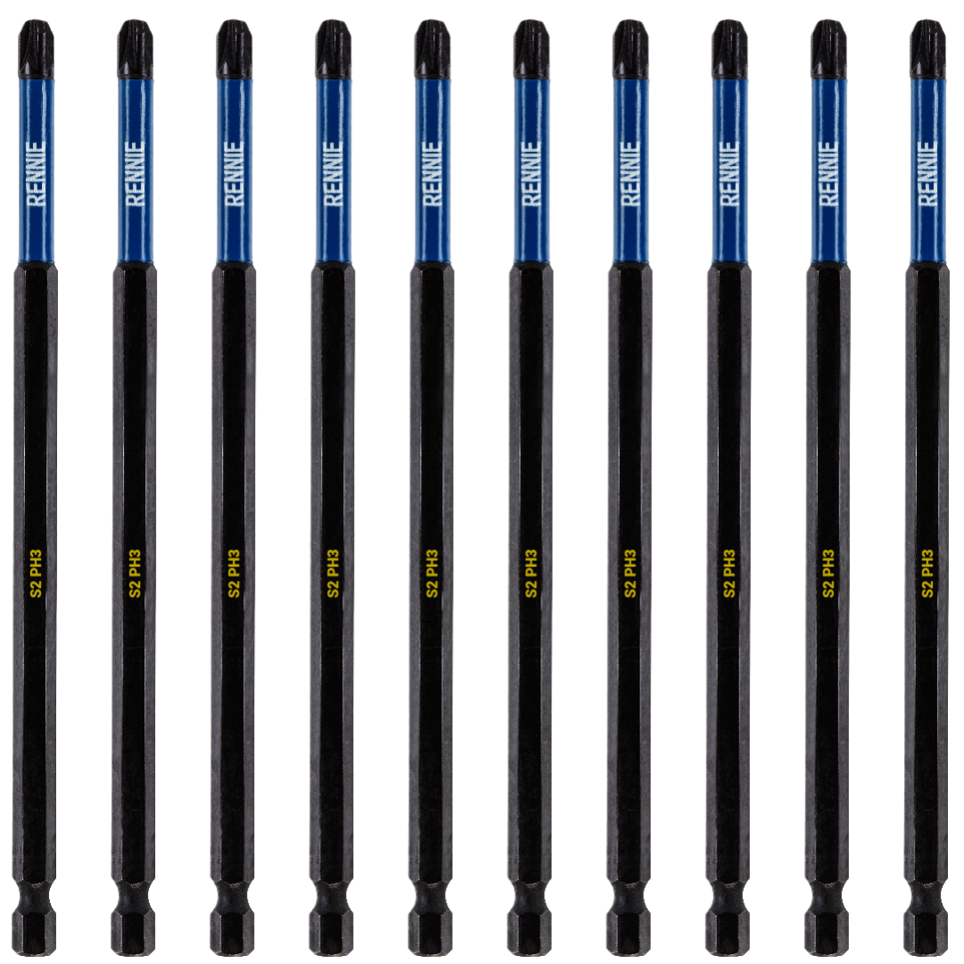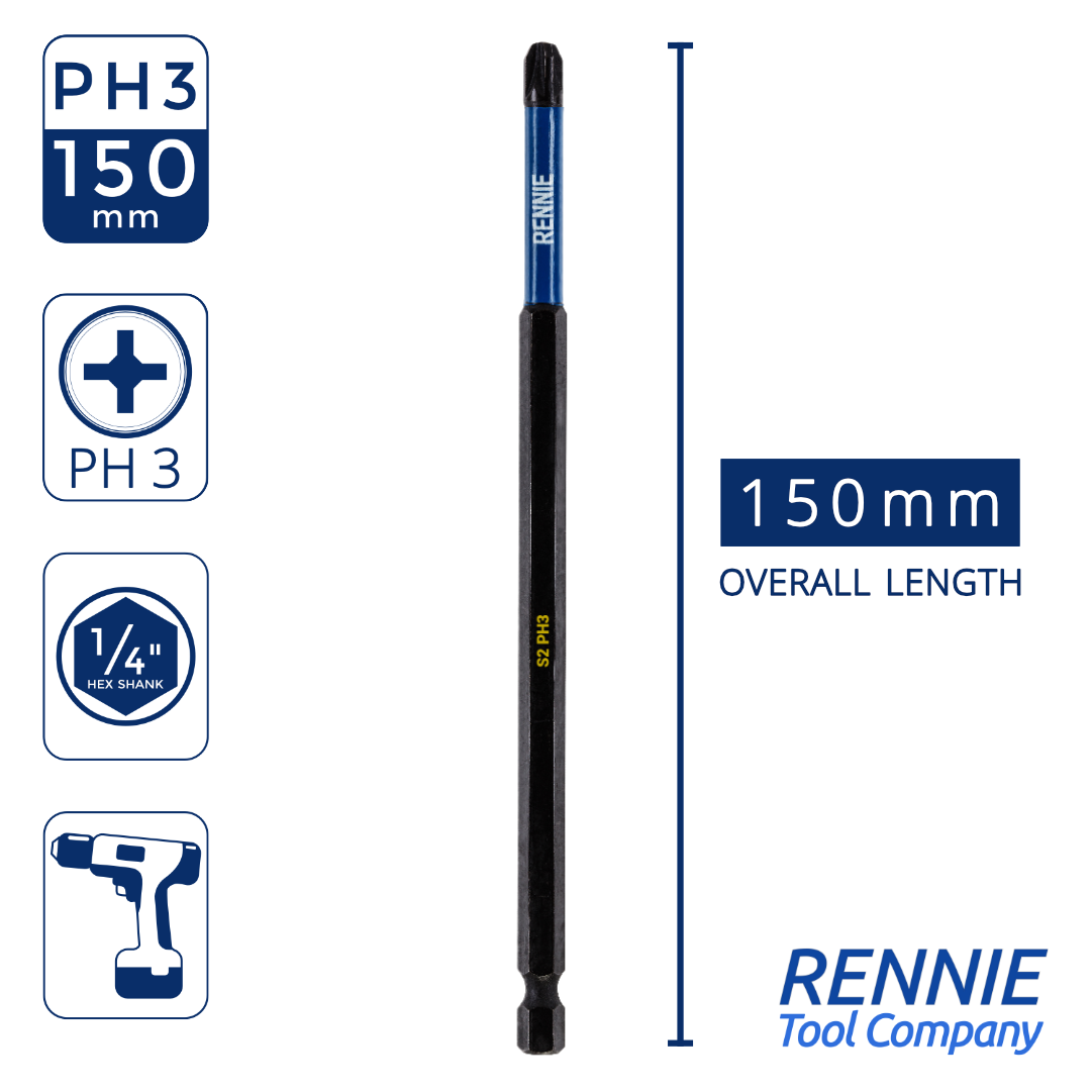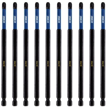 - 10 piece Rennie Tool Company PH3 impact driver bits set.. These Phillips No.3 impact driver drill bits are 150mm (6") overall length. They are supplied in a plastic storage case. Manufactured using high quality S2 steel and using the latest manufacturing technologies.