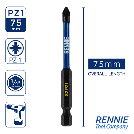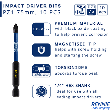 - This screwdriver bits set includes 10 PZ1 impact bits that are an overall length of 75mm. They are supplied in a plastic storage case. These long pz1 impact driver bits are manufactured using high quality S2 steel and using the latest manufacturing technologies.