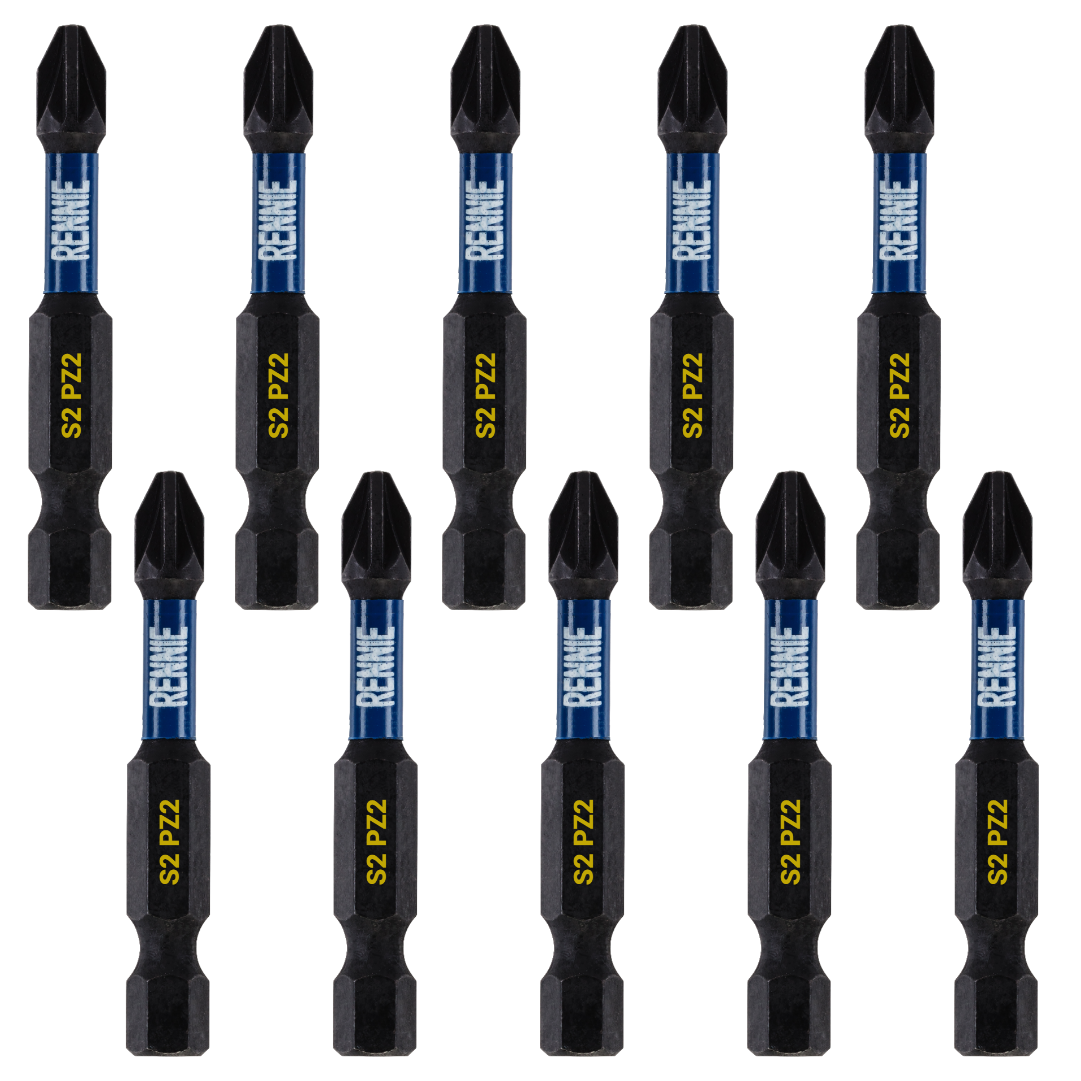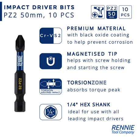 - This screwdriver bits set includes 10 PZ2 impact bits that are an overall length of 50mm. They are supplied in a plastic storage case. These pz2 impact driver bits are manufactured using high quality S2 steel and using the latest manufacturing technologies.