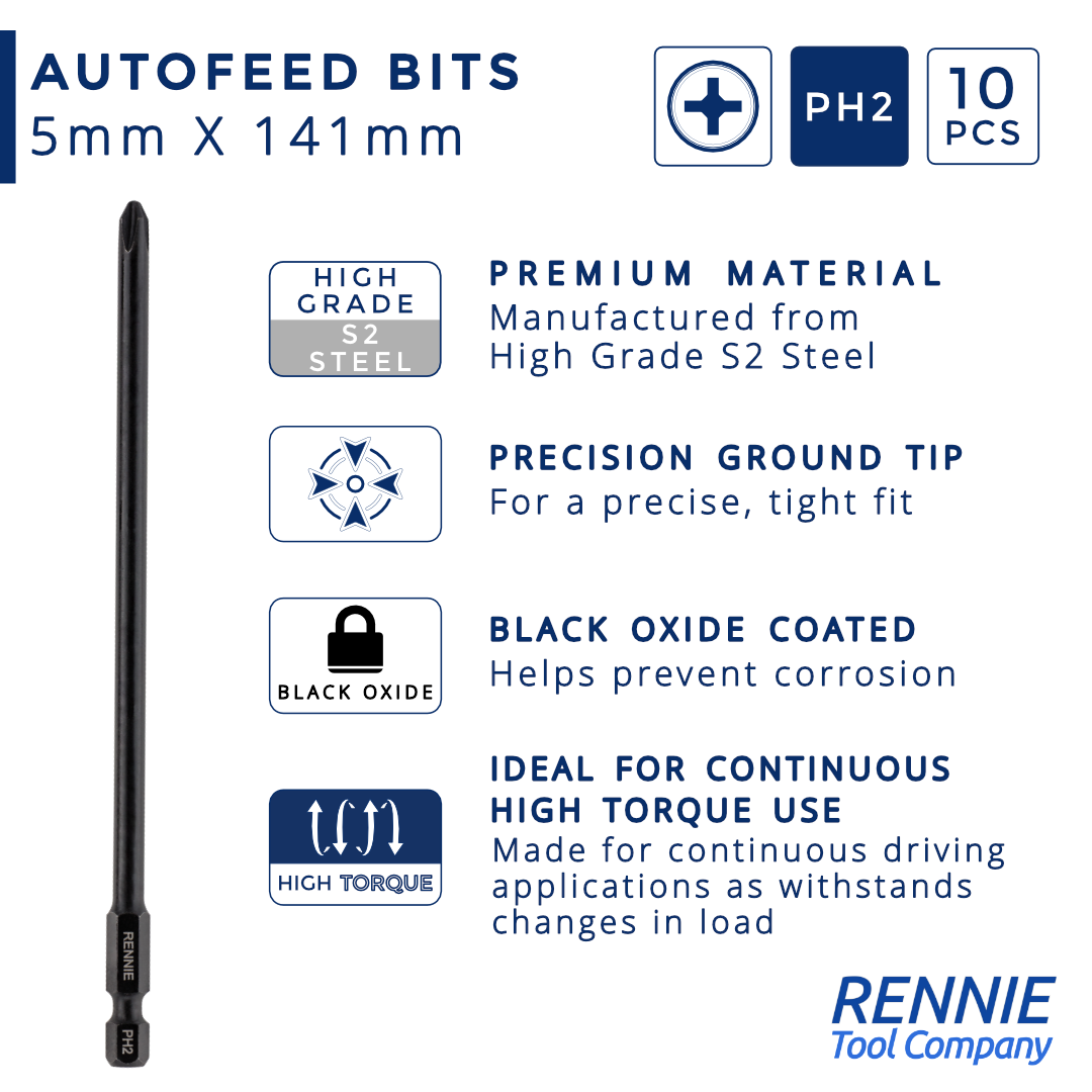 - Pack of 10 x PH2 x 141mm autofeed bits supplied in a resealable storage pouch