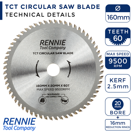 160mm diameter x 60 teeth saw blade. This blade has a 20mm bore so will fit any saw that has a 20mm bore. This circular blade also comes with a 16mm reduction ring so these blades will also fit any circular saw that has a 16mm bore.