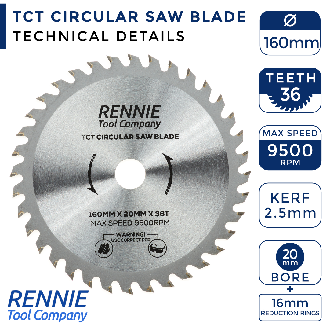 160mm diameter x 36 teeth saw blade. This blade has a 20mm bore so will fit any saw that has a 20mm bore. This circular blade also comes with a 16mm reduction ring so these blades will also fit any circular saw that has a 16mm bore.