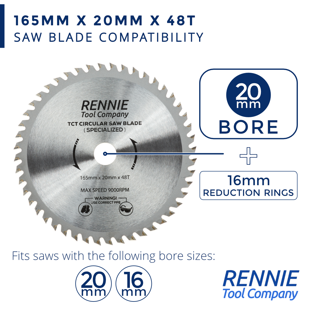 This 165mm circular saw blade has 48 teeth and a 20mm bore so will fit any saw that has a 20mm bore. This circular blade also comes with a 16mm reduction ring so these blades will also fit any circular saw that has a 16mm bore.
