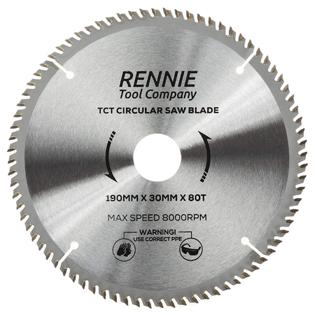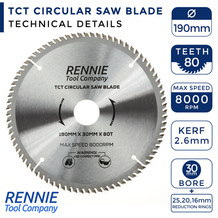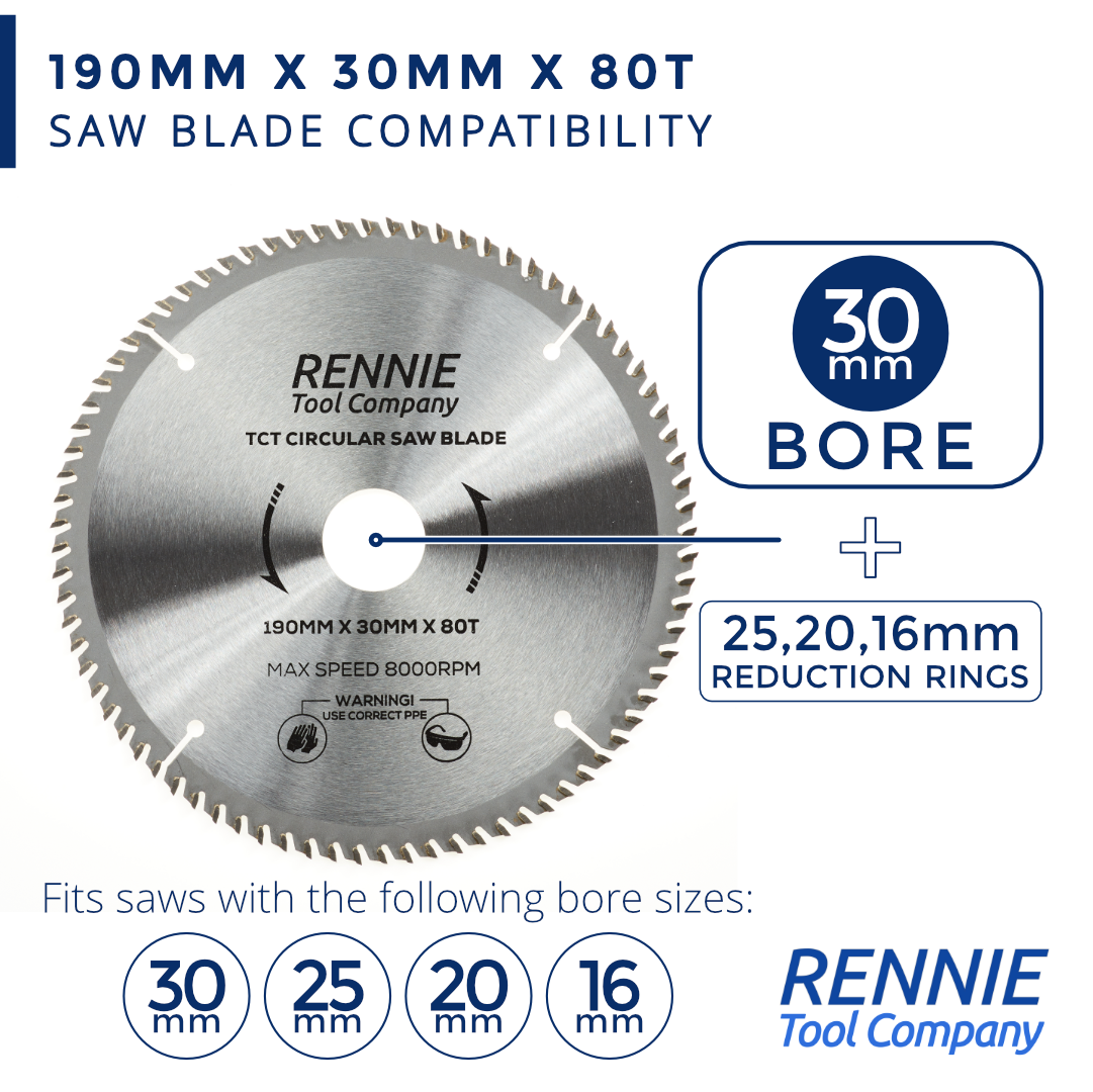 - This 190mm saw blade has 80 teeth and a 30mm bore so will fit any saw that has a 30mm bore. This circular blade also comes with a 25mm Bore, 20mm Bore and 16mm Bore reduction rings so these blades will also fit any circular saw that has a 25mm, 20mm or 16mm bore.