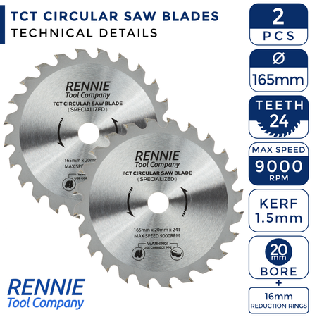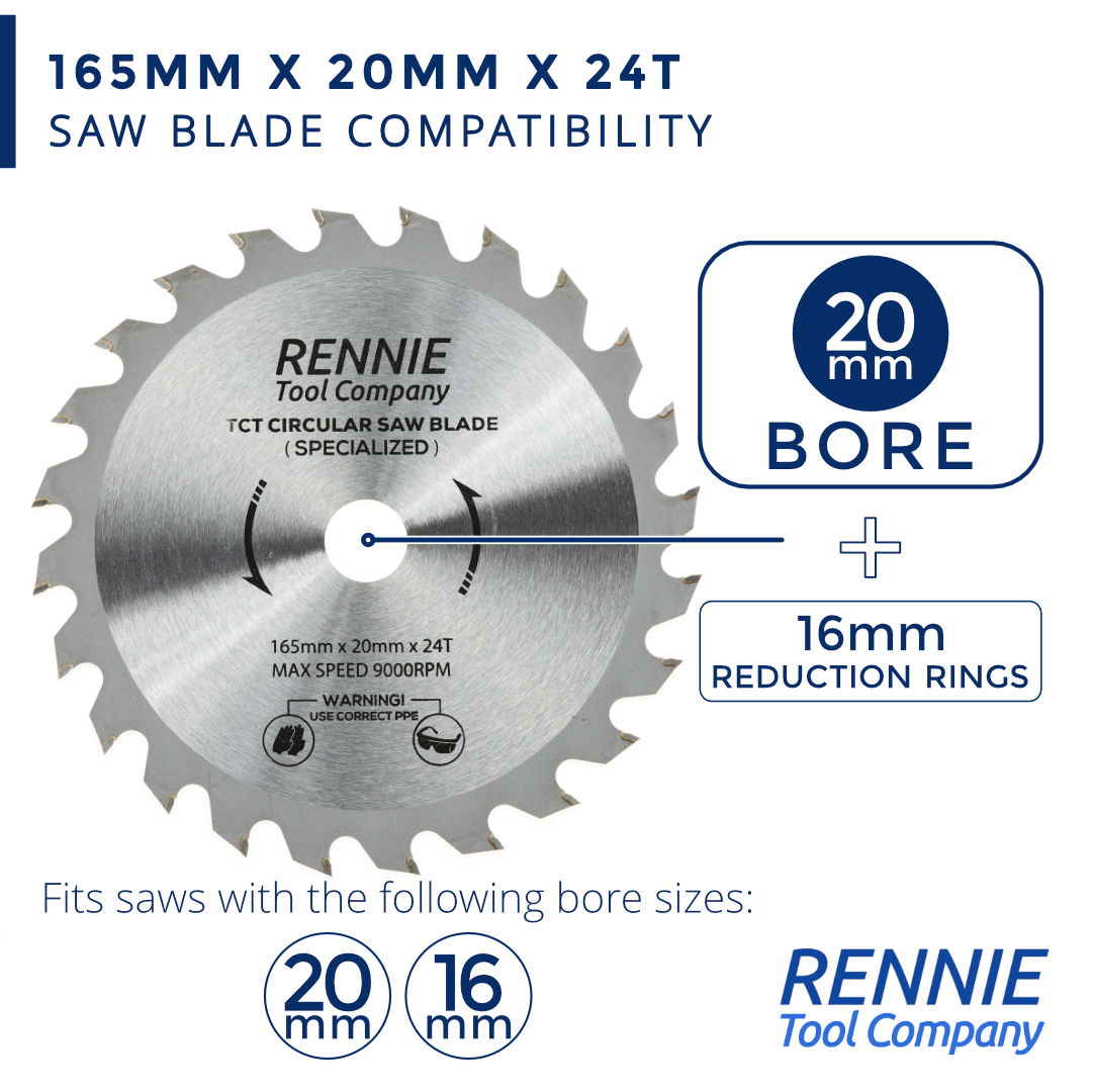 These 165mm circular saw blades have 24 teeth and a 20mm bore so will fit any saw that has a 20mm bore. These circular blades also comes with 16mm reduction rings so these blades will also fit any circular saw that has a 16mm bore.