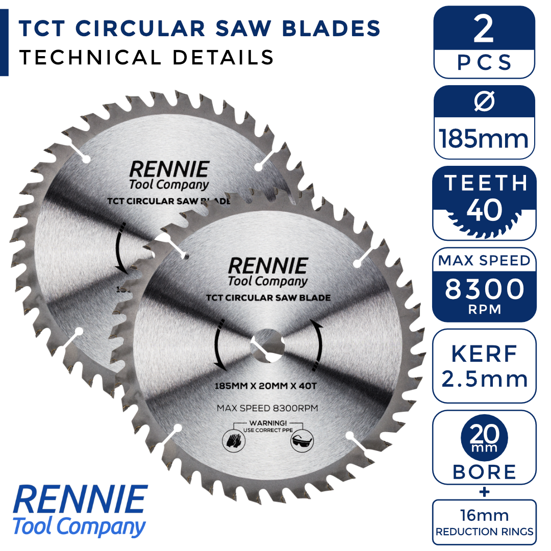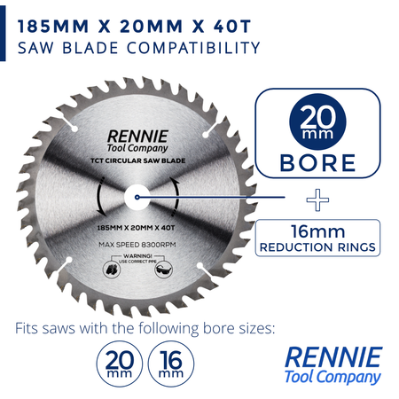 - This pack of 2 x 185mm saw blades have 40 teeth and a 20mm bore so will fit any saw that has a 20mm bore. These circular blades also come with 16mm Bore reduction rings so these blades will also fit any circular saw that has a 20mm or 16mm bore.