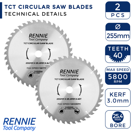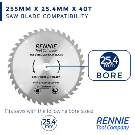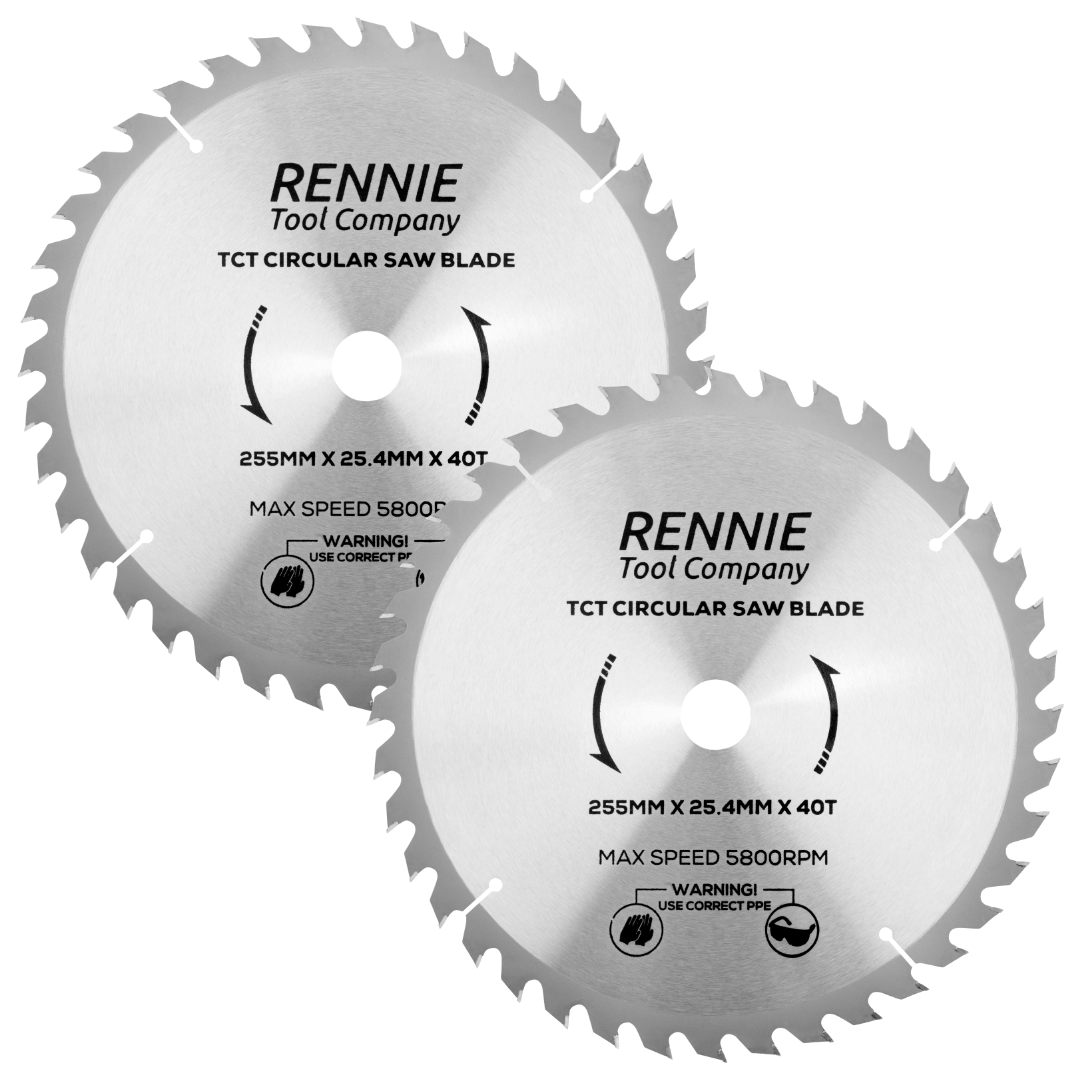 - Pack of 2 x 255mm saw blade 25.4mm bore (1" Bore) - These circular saw blades have 40 teeth and have a 25.4mm bore so will fit any saw that has a 25.4mm bore.