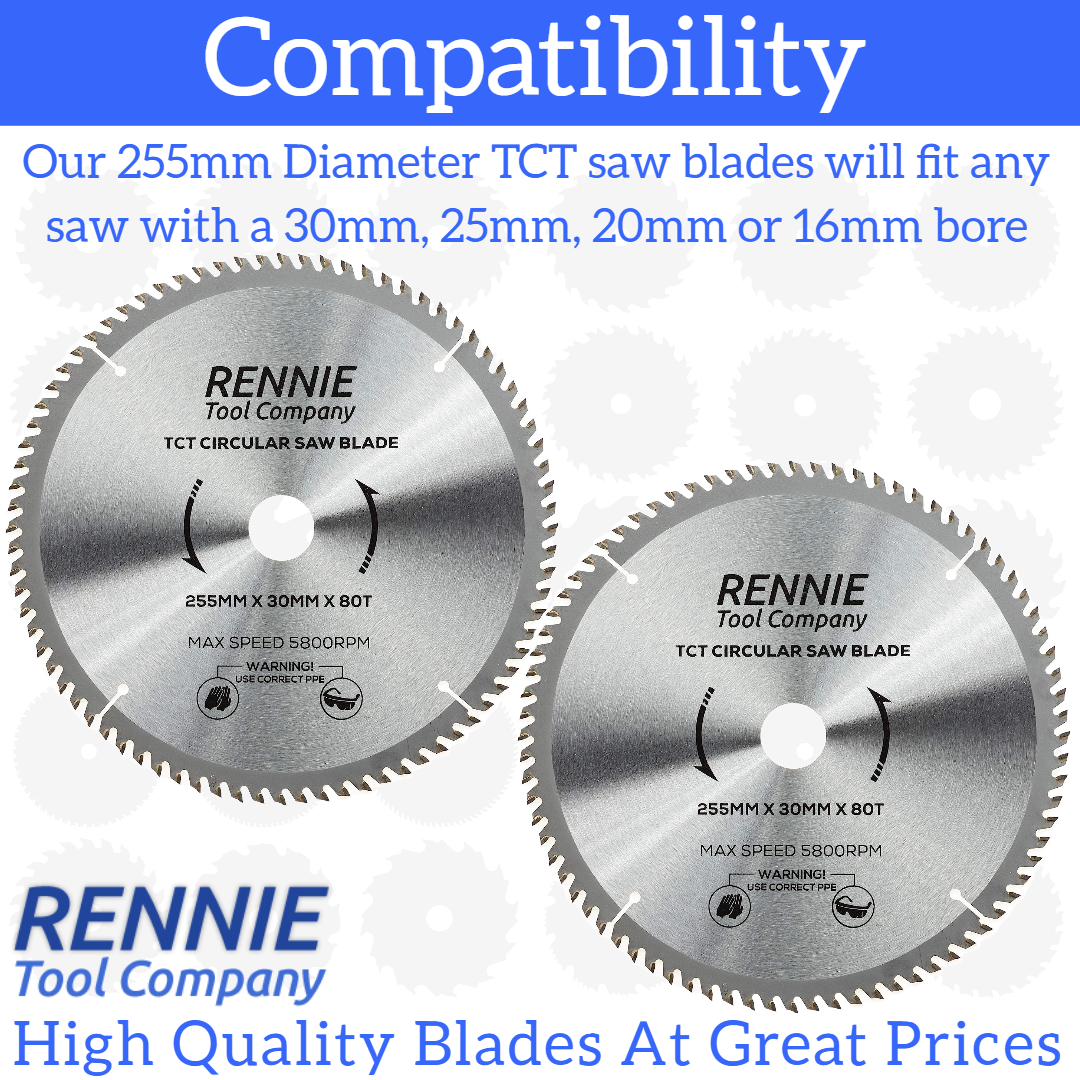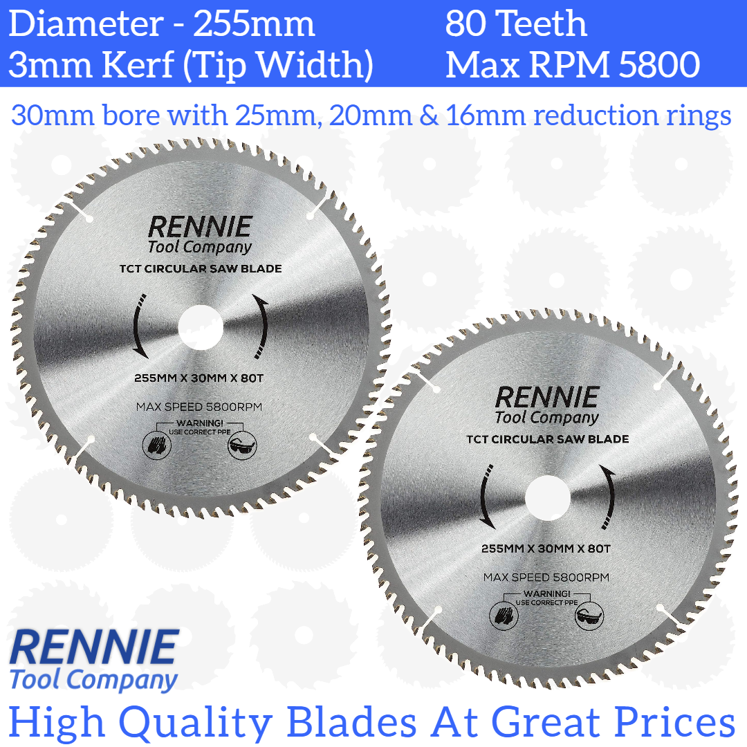 - Pack of 2 - 255mm saw blades 30mm bore - These circular saw blades have 80 teeth and have a 30mm bore so will fit any saw that has a 30mm bore. They also come with a 25mm Bore, 20mm Bore and 16mm Bore reduction rings so these blades will also fit any circular saw that has a 25mm, 20mm or 16mm bore.