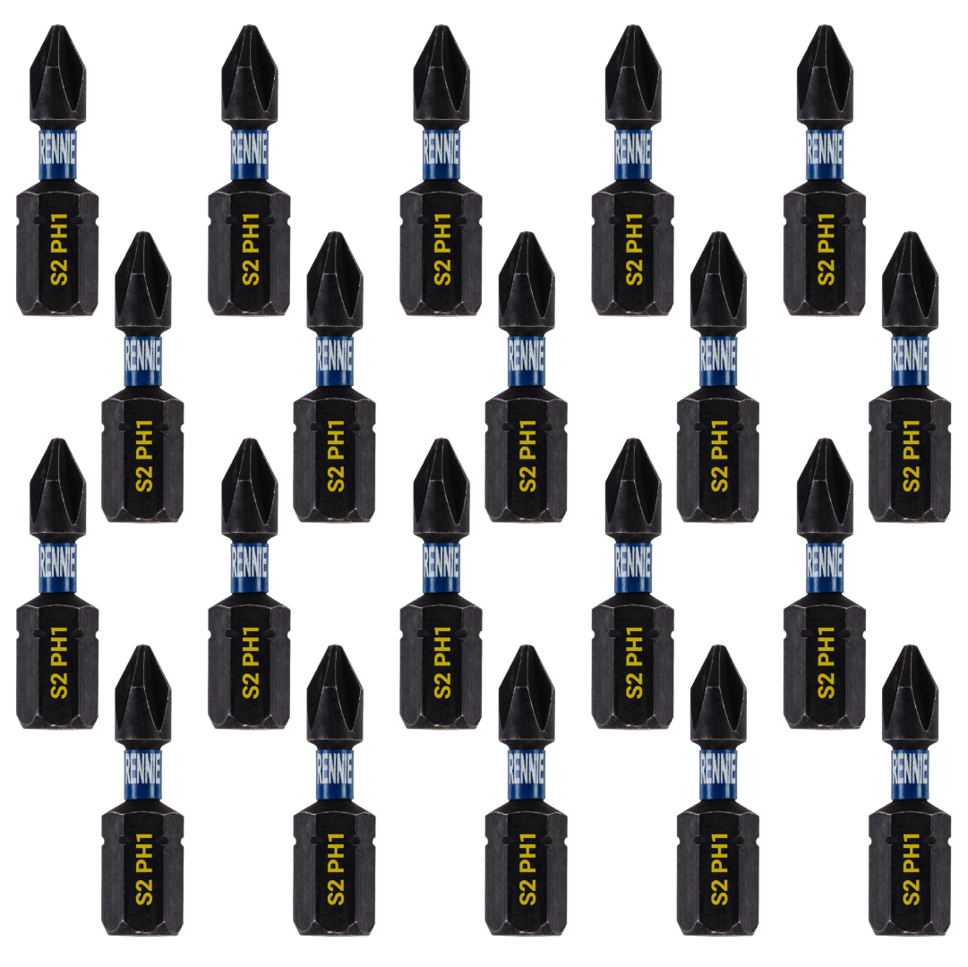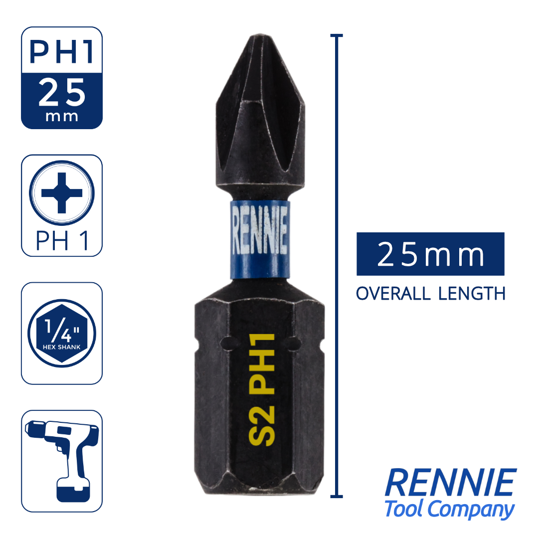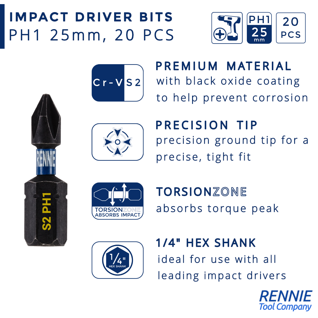 - 20 piece Rennie Tool Company PH1 impact driver bits set. These Phillips No.1 impact driver drill bits are 25mm (1") overall length. They are supplied in a plastic storage case. Manufactured using high quality S2 steel and using the latest manufacturing technologies.