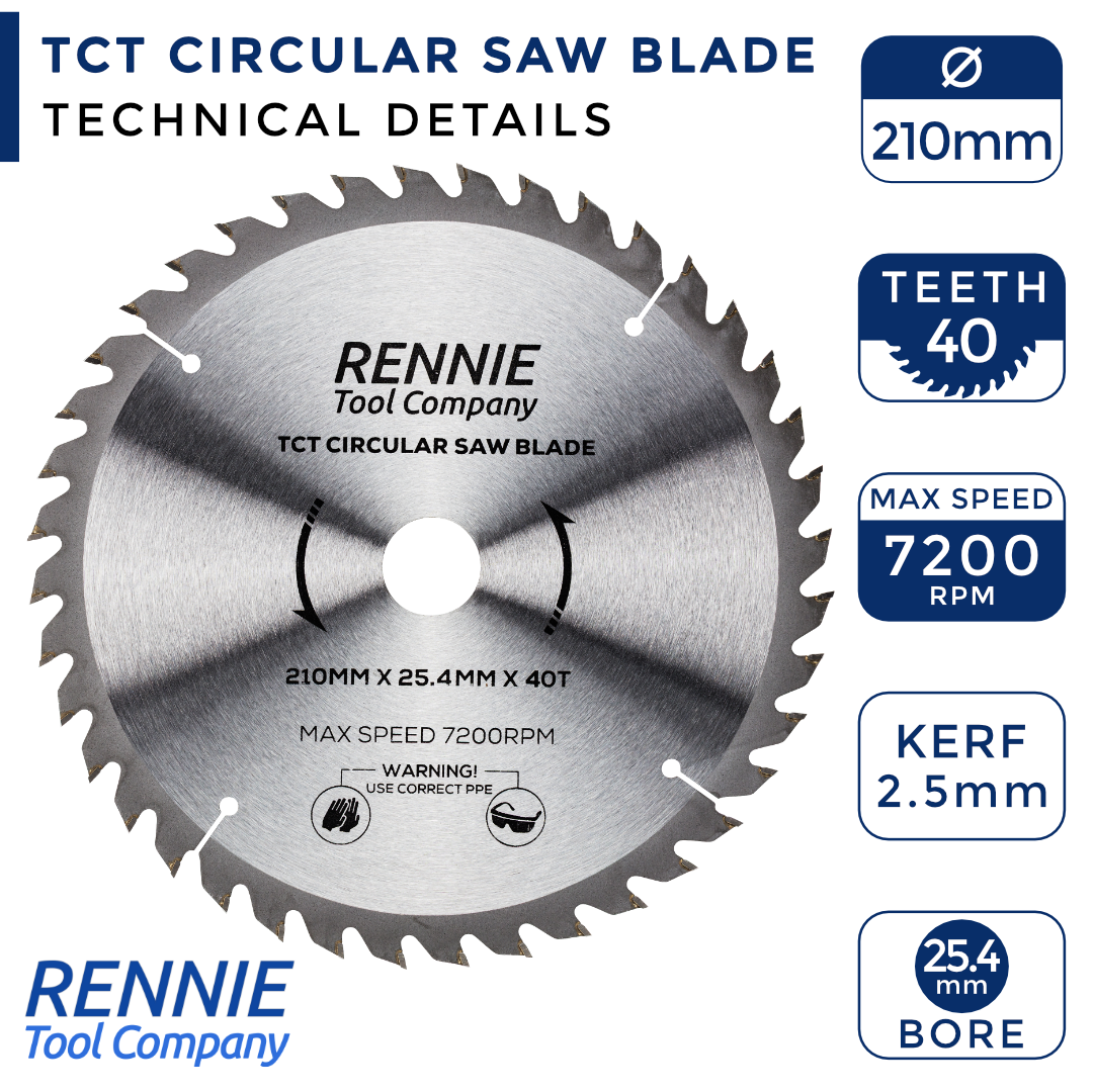 - 210mm saw blade 25.4mm bore (1" Bore) - This circular saw blade has 40 teeth and have a 25.4mm bore so will fit any saw that has a 25.4mm bore.
