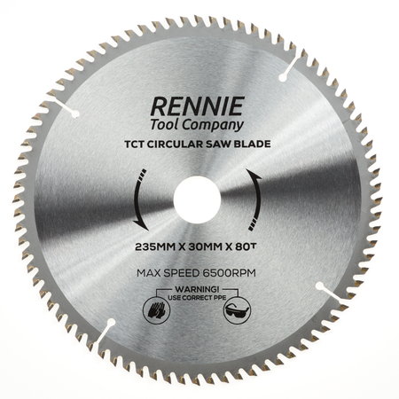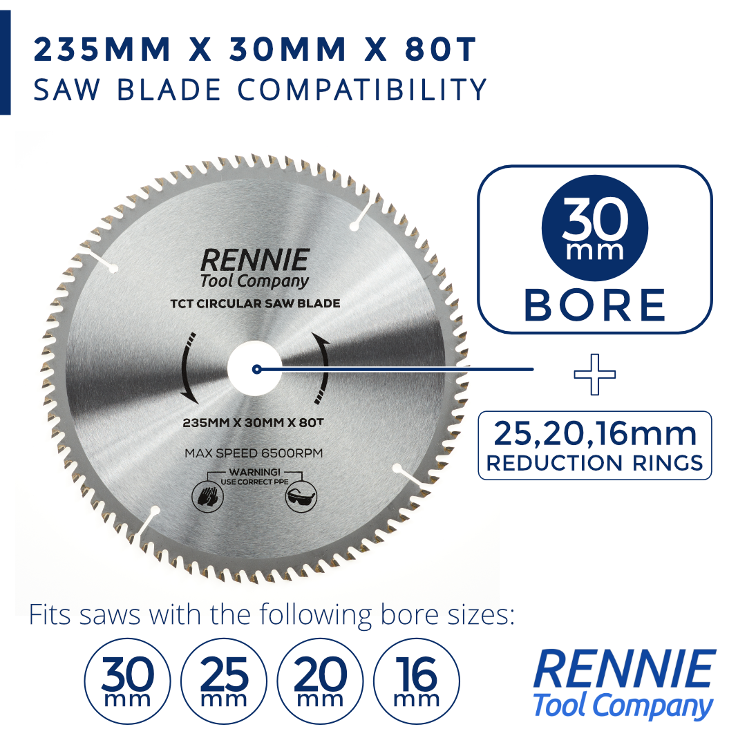 - 235mm saw blade - This circular saw blade has 80 teeth and a 30mm bore so will fit any saw that has a 30mm bore. They also come with a 25mm Bore, 20mm Bore and 16mm Bore reduction rings so these blades will also fit any circular saw that has a 25mm, 20mm or 16mm bore.