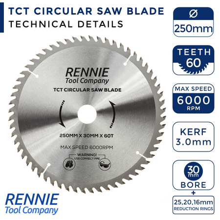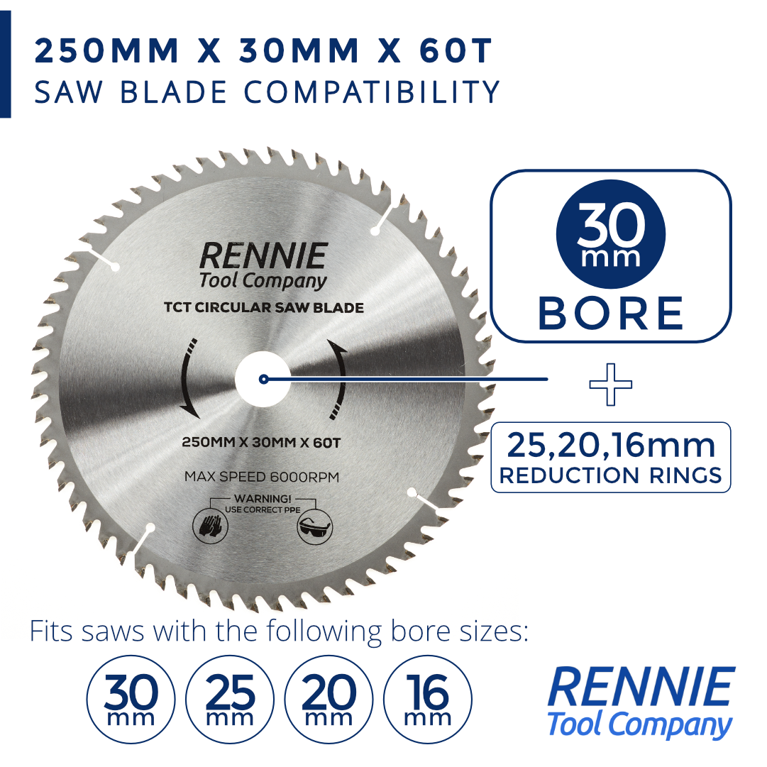 - 250mm saw blade 30mm bore - This circular saw blade has 60 teeth and a 30mm bore so will fit any saw that has a 30mm bore. They also come with a 25mm Bore, 20mm Bore and 16mm Bore reduction rings so these blades will also fit any circular saw that has a 25mm, 20mm or 16mm bore.