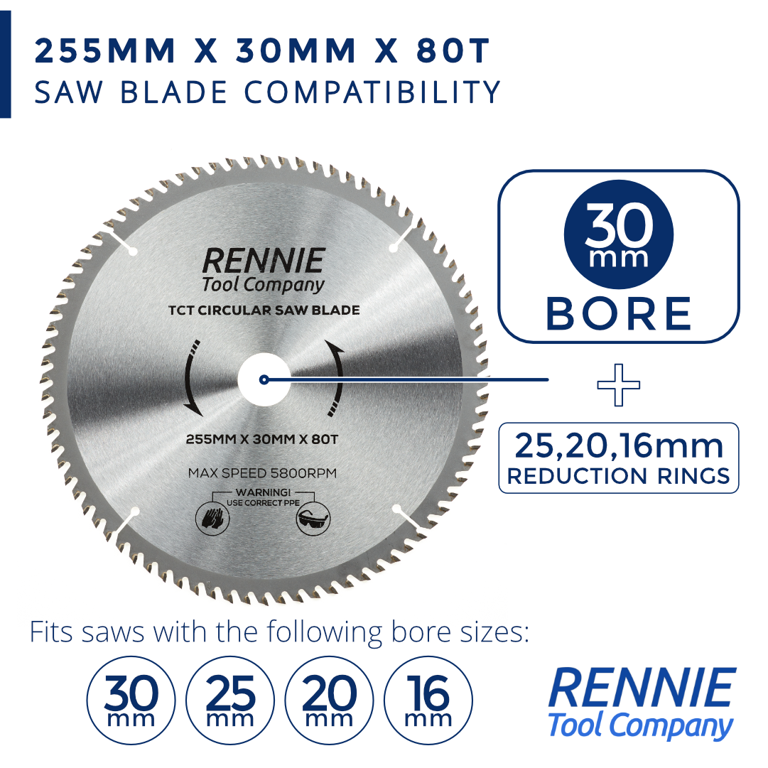 - 255mm saw blade 30mm bore - This circular saw blade has 80 teeth and a 30mm bore so will fit any saw that has a 30mm bore. They also come with a 25mm Bore, 20mm Bore and 16mm Bore reduction rings so these blades will also fit any circular saw that has a 25mm, 20mm or 16mm bore.
