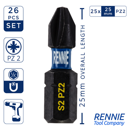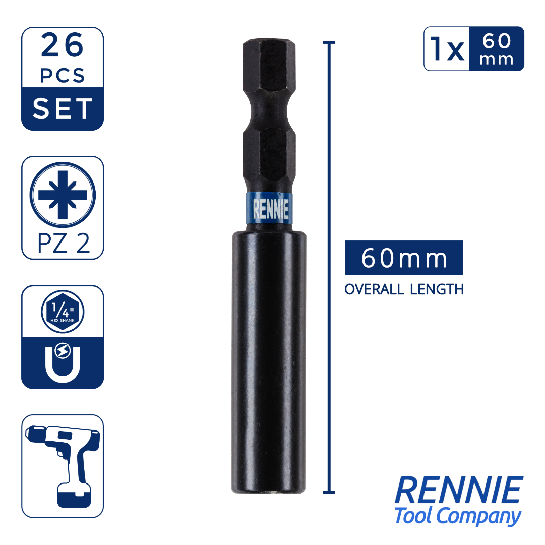 - This screwdriver bits set includes a 60mm long impact bit holder and 25 PZ2 impact bits that are an overall length of 25mm. They are supplied in a heavy duty plastic storage case.