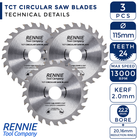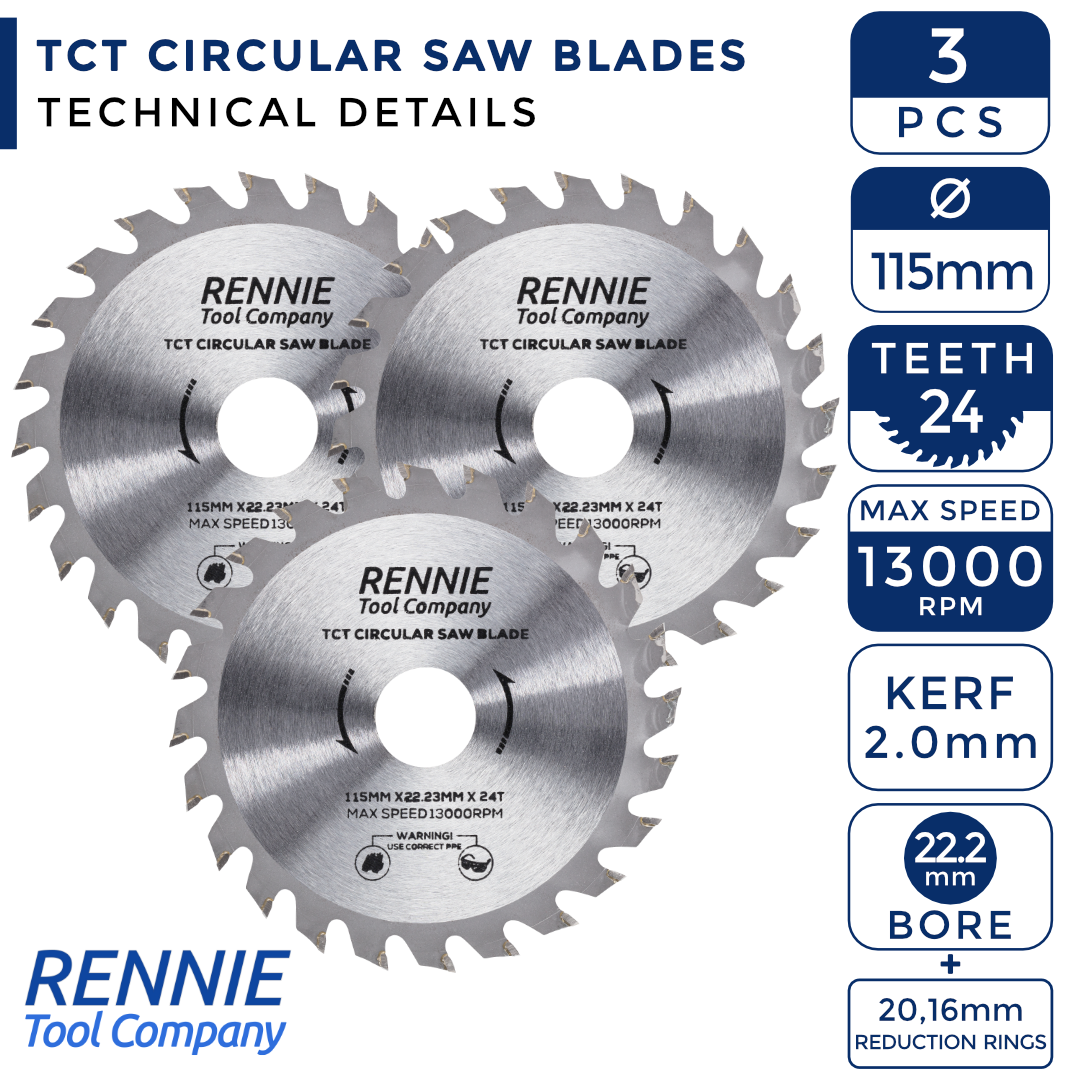 - These 115mm diameter saw blades have 24 teeth. They have a 7/8" (22.23mm) bore so will fit any saw that has a 7/8" (22.23mm) bore. Each circular blade also comes with a 20mm and a 16mm reduction ring so these blades will also fit any circular saw that has a 20mm or 16mm bore as well.