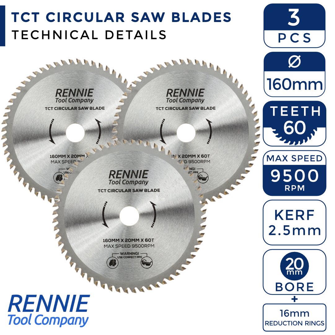 Pack of 3 - 160mm diameter x 60 teeth saw blades. These blades have a 20mm bore so will fit any saw that has a 20mm bore. These circular blades also comes with 16mm reduction rings so will also fit any circular saw that has a 16mm bore.