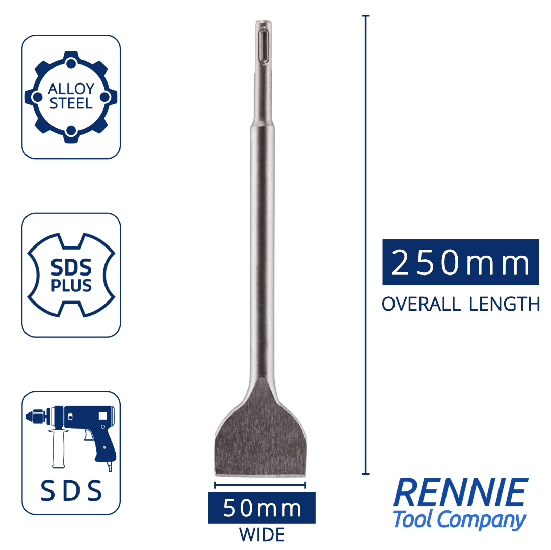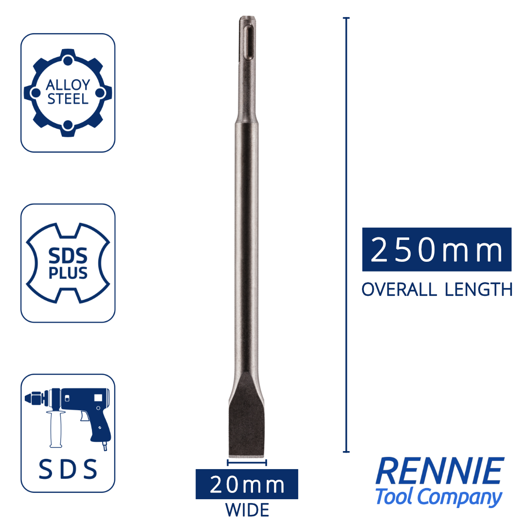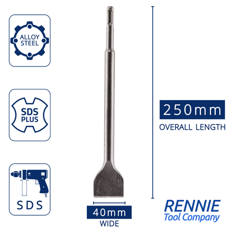 - Manufactured from high quality tempered steel. These SDS flat chisel drill bits are made from hardened alloy steel. Dimensions - 20mm /40mm / 50mm wide at the tip x 250mm overall length. They also have a 14mm shank which provides increased strength.