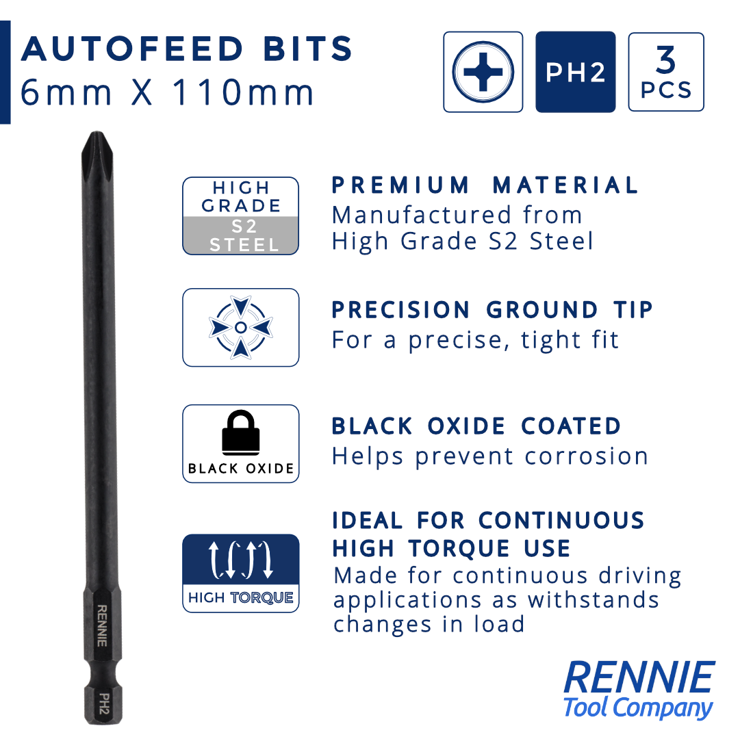 - Pack of 3 x PH2 x 110mm autofeed bits supplied in a resealable storage pouch