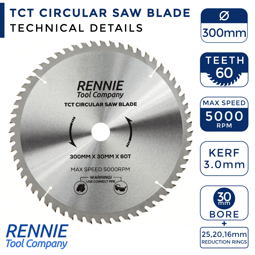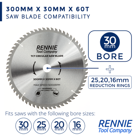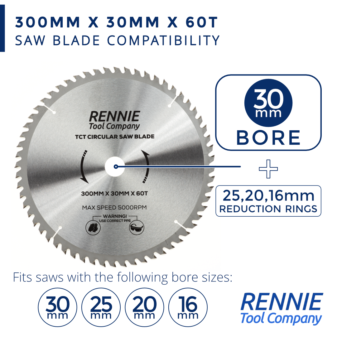 - 300mm saw blade 30mm bore - This circular saw blade has 60 teeth and a 30mm bore so will fit any saw that has a 30mm bore. They also come with a 25mm Bore, 20mm Bore and 16mm Bore reduction rings so these blades will also fit any circular saw that has a 25mm, 20mm or 16mm bore.