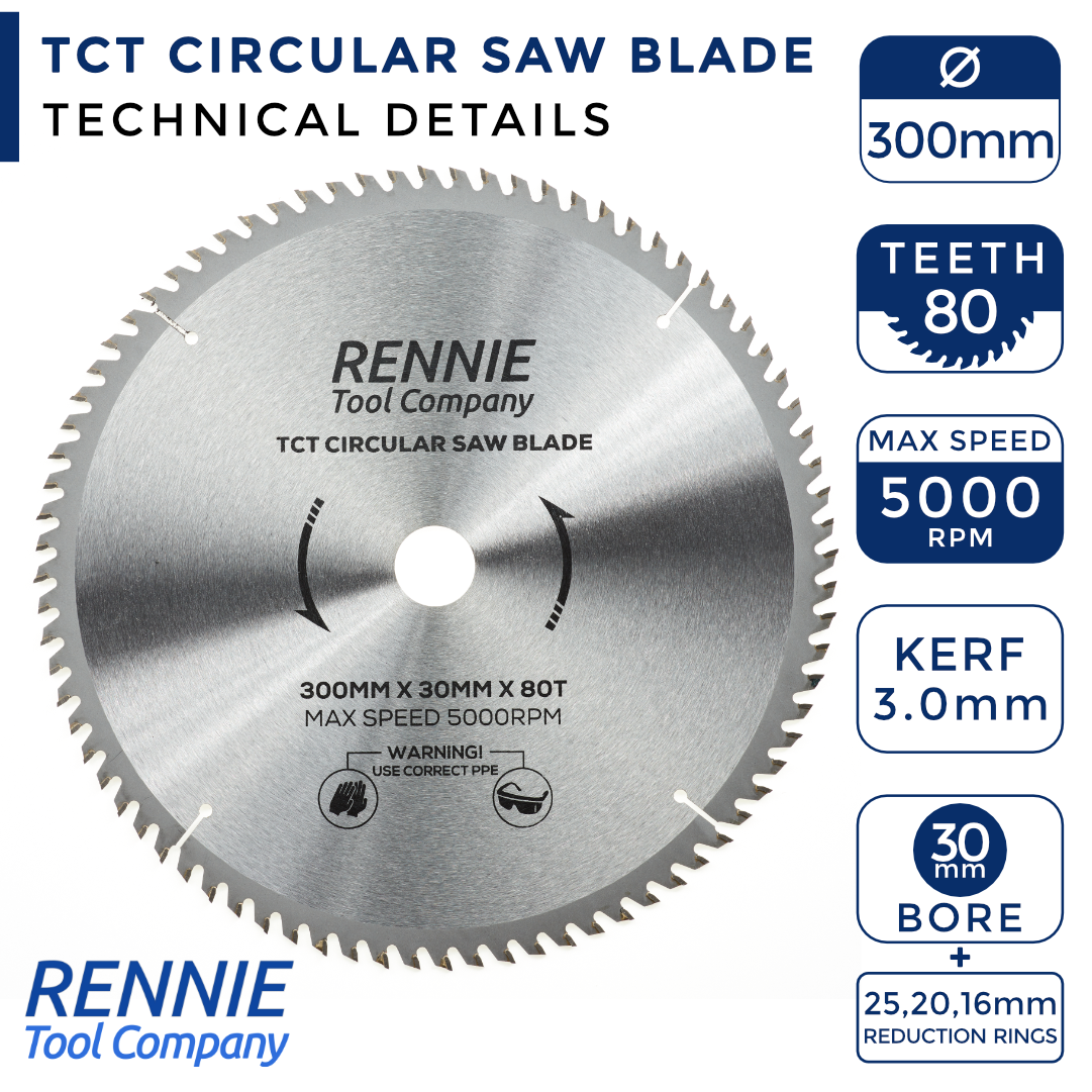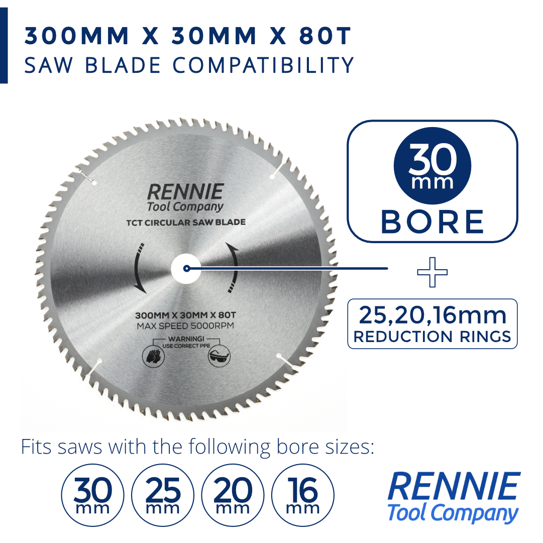 - 300mm saw blade 30mm bore - This circular saw blade has 80 teeth and a 30mm bore so will fit any saw that has a 30mm bore. They also come with a 25mm Bore, 20mm Bore and 16mm Bore reduction rings so these blades will also fit any circular saw that has a 25mm, 20mm or 16mm bore.