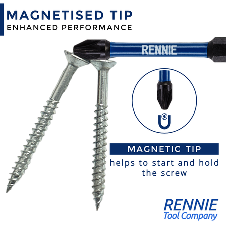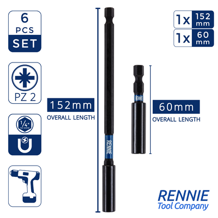 - 4 piece Rennie Tool Company impact driver bits set. This impact screwdriver set includes 1 x 60mm long impact bit holder, 1 x 152mm long impact bit holder and 1 x 50mm long PH2 magnetic impact driver bit (Phillips No.2) and 1 x 100mm long PZ2 magnetic impact driver bit (pozidrive no.2).