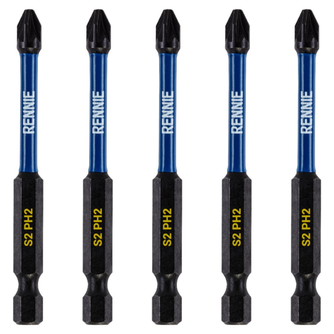 - 5 piece Rennie Tool Company magnetic PH2 impact driver bits set.. These Phillips No.2 impact driver drill bits are 75mm (3") overall length. They are supplied in a plastic storage case. Manufactured using high quality S2 steel and using the latest manufacturing technologies.