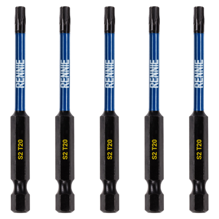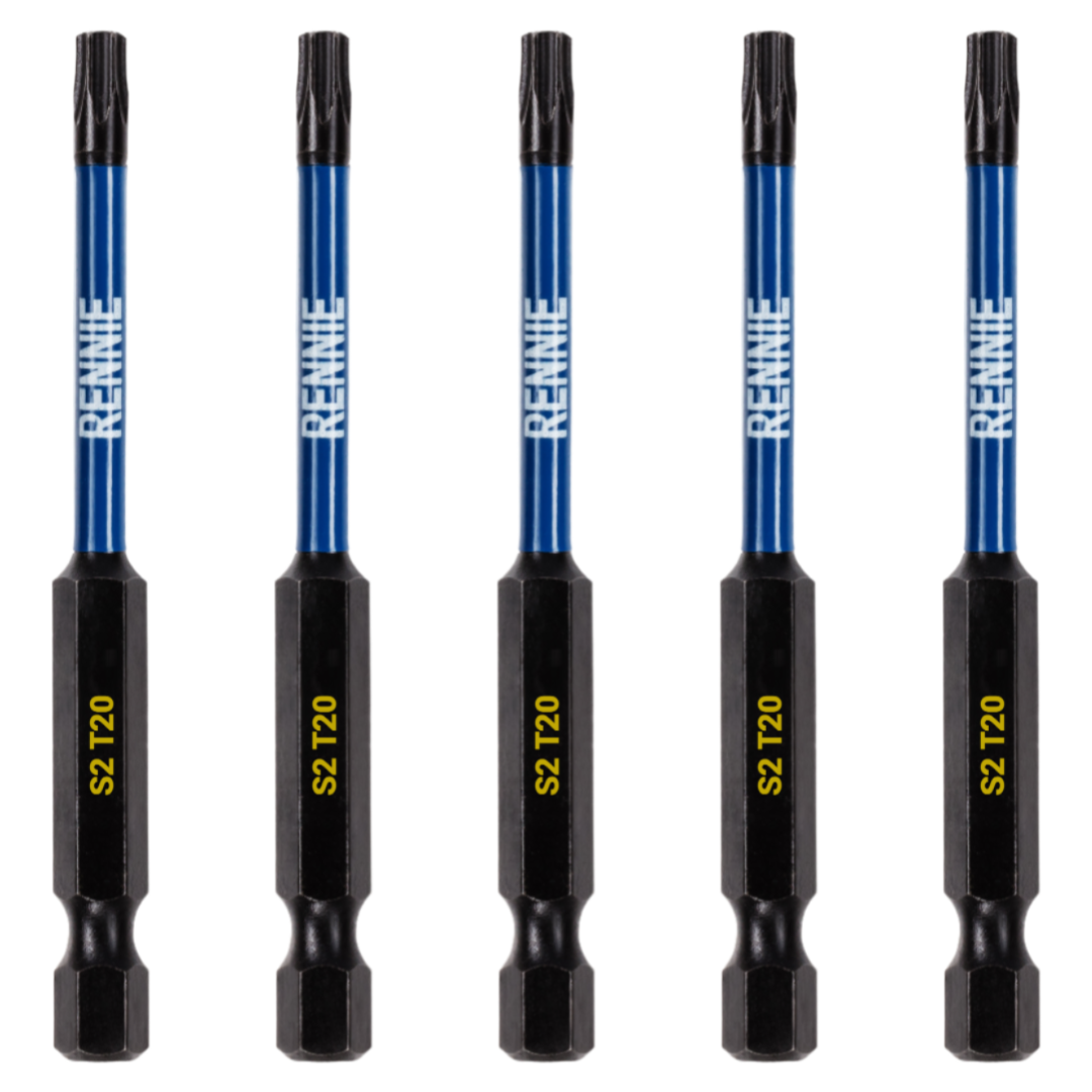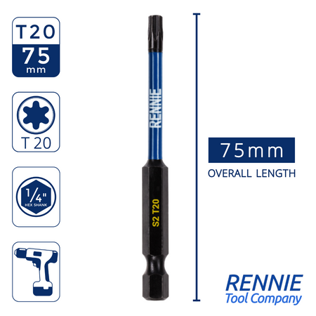 - This T20 torx screwdriver bits set includes 5 x T20 impact bits that are an overall length of 75mm. They are supplied in a plastic storage wallet. These 75mm long reach T20 Torx impact driver bits are manufactured using high quality S2 steel and using the latest manufacturing technologies.