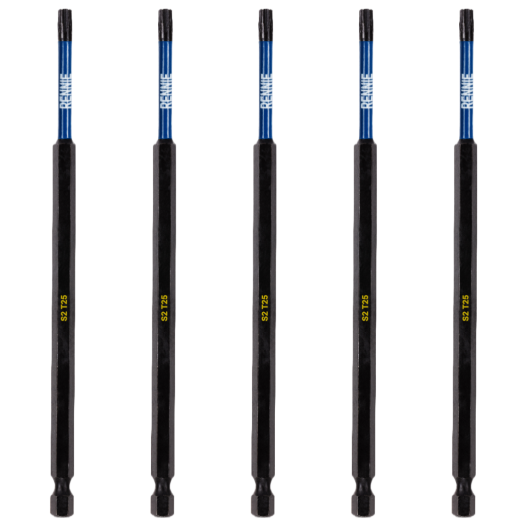 - This T25 torx screwdriver bits set includes 5 x T25 impact bits that are an overall length of 150mm. They are supplied in a plastic storage wallet. These 150mm long reach T25 Torx impact driver bits are manufactured using high quality S2 steel and using the latest manufacturing technologies.