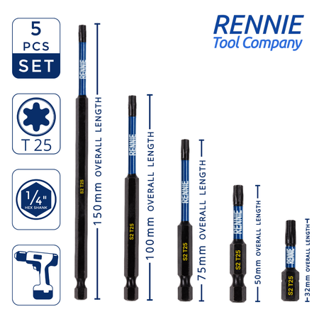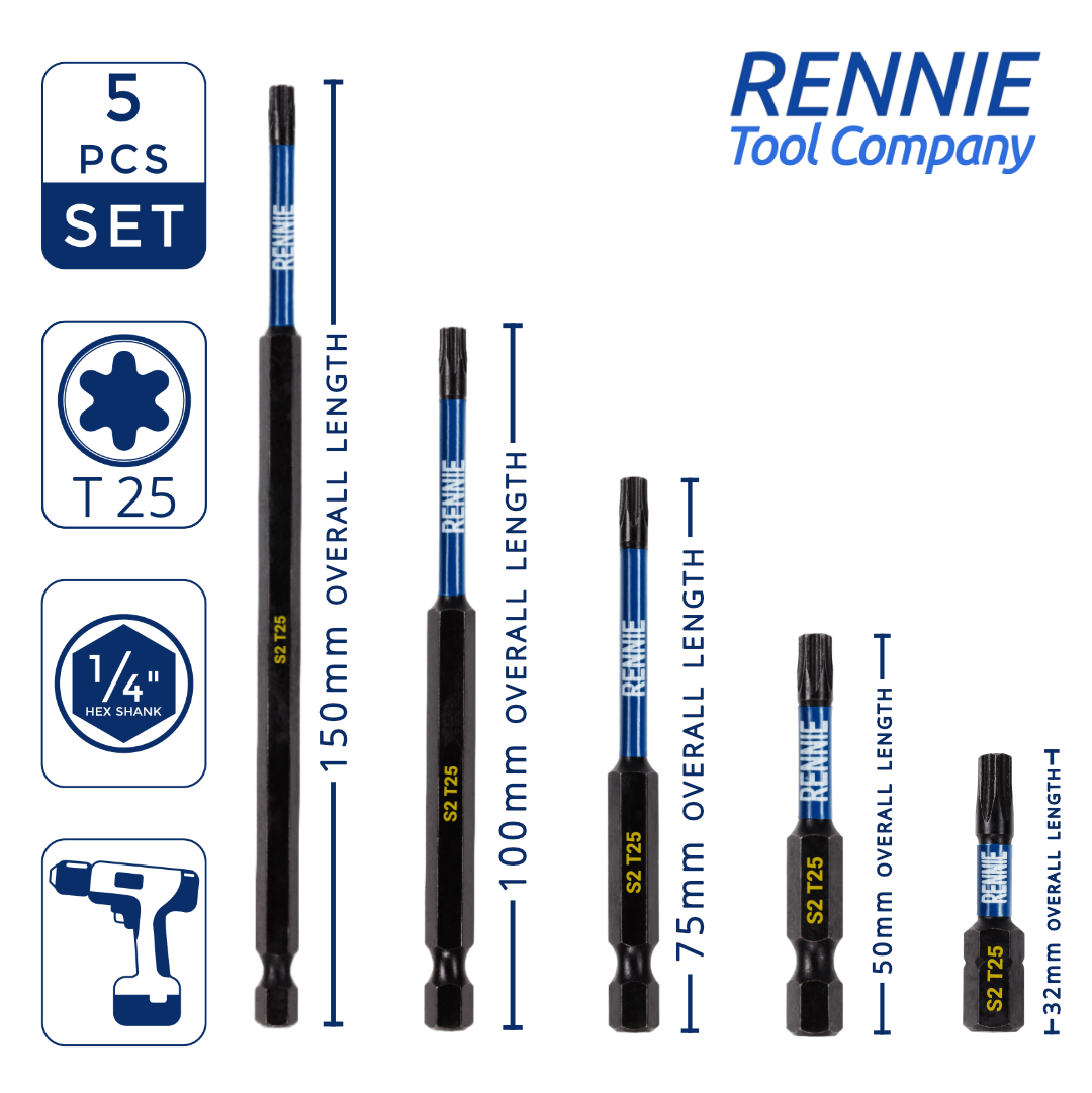 - Set of 5 T25 torx screwdriver bits. This set includes 1 x 32mm T25 torx impact bit, 1 x 50mm long T25 torx bit, 1 x 75mm long T 25 torx bit, 1 x 100mm long T25 torx bit and 1 x 150mm long T25 torx impact bit They are supplied in a plastic storage wallet. These long reach T25 Torx impact driver bits are manufactured using high quality S2 steel and using the latest manufacturing technologies.