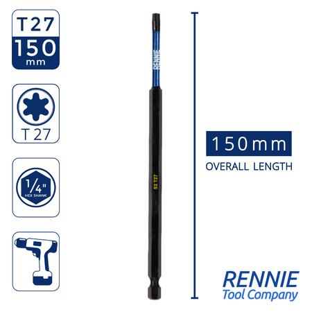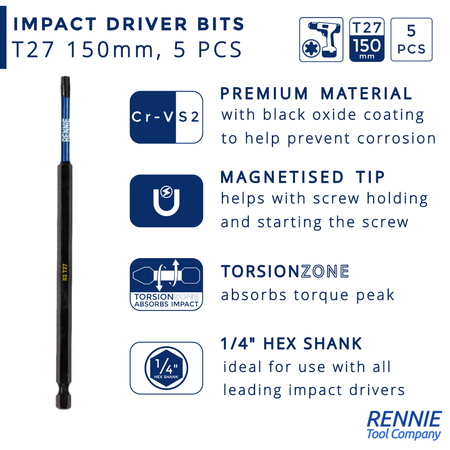 - This T27 torx screwdriver bits set includes 5 x T27 impact bits that are an overall length of 150mm. They are supplied in a plastic storage wallet. These 150mm long reach T27 Torx impact driver bits are manufactured using high quality S2 steel and using the latest manufacturing technologies.