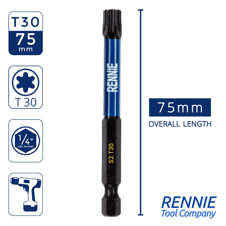 - This T30 torx screwdriver bits set includes 5 x T30 impact bits that are an overall length of 75mm. They are supplied in a plastic storage wallet. These 75mm long reach T30 Torx impact driver bits are manufactured using high quality S2 steel and using the latest manufacturing technologies.