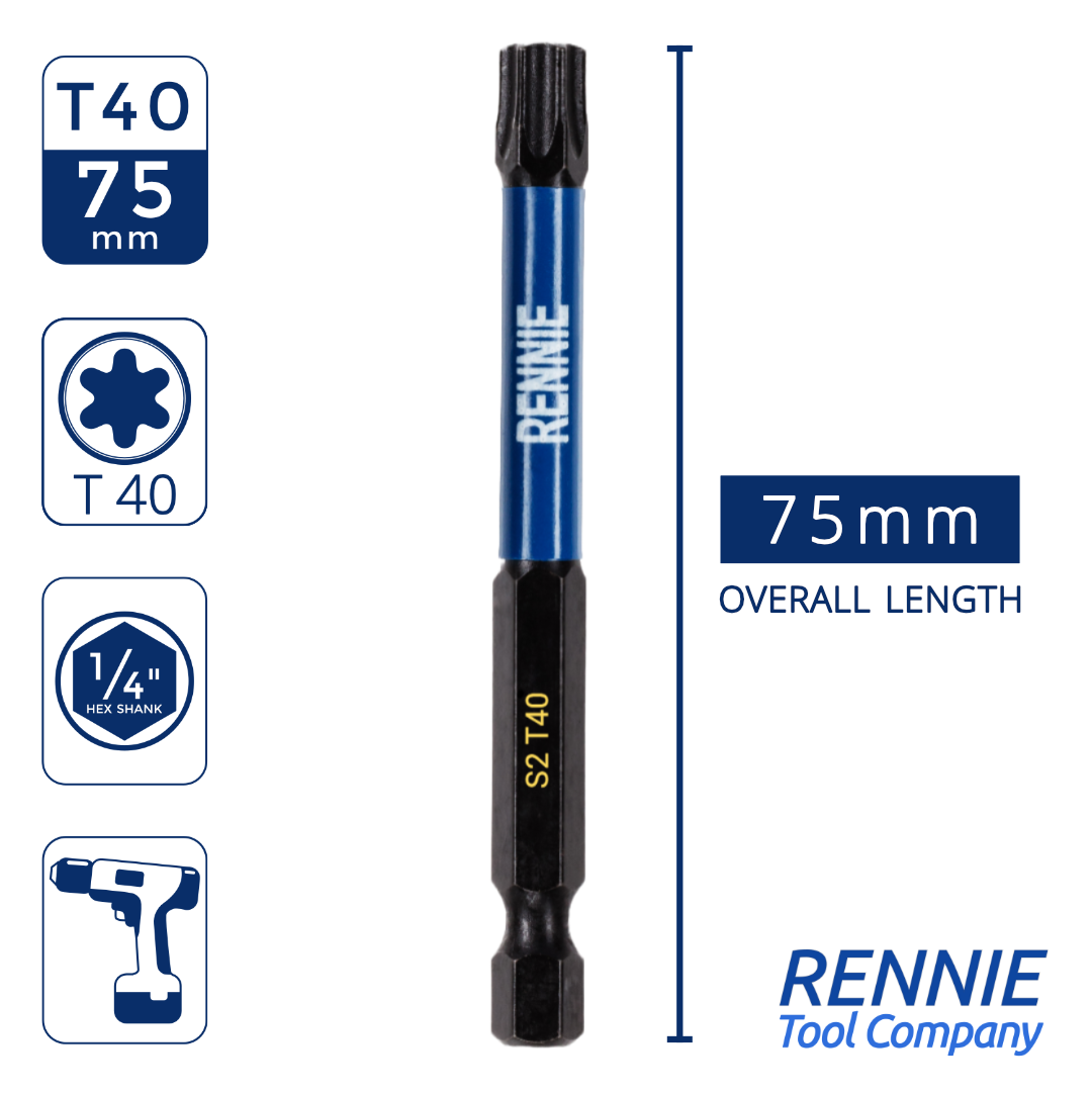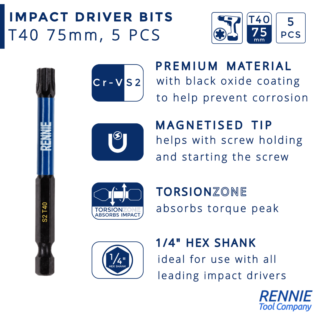 - This T40 torx screwdriver bits set includes 5 x T40 impact bits that are an overall length of 75mm. They are supplied in a plastic storage wallet. These 75mm long reach T40 Torx impact driver bits are manufactured using high quality S2 steel and using the latest manufacturing technologies.