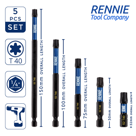 - Set of 5 T40 Torx screwdriver bits. This set includes 1 x 32mm T40 torx impact bit, 1 x 50mm long T40 torx bit, 1 x 75mm long T 40 torx bit, 1 x 100mm long T40 torx bit and 1 x 150mm long T40 torx impact bit They are supplied in a plastic storage wallet. These long reach T40 Torx impact driver bits are manufactured using high quality S2 steel and using the latest manufacturing technologies.