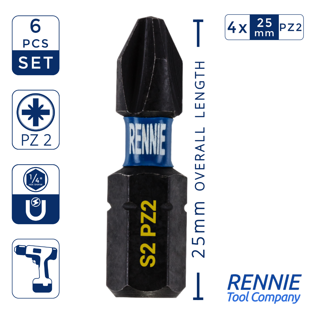 - 6 piece Rennie Tool Company impact driver bits set. This impact screwdriver set includes 1 x 60mm long impact bit holder, 1 x 152mm long impact bit holder and 4 x 25mm long PZ2 impact driver bit (pozidrive no.2).