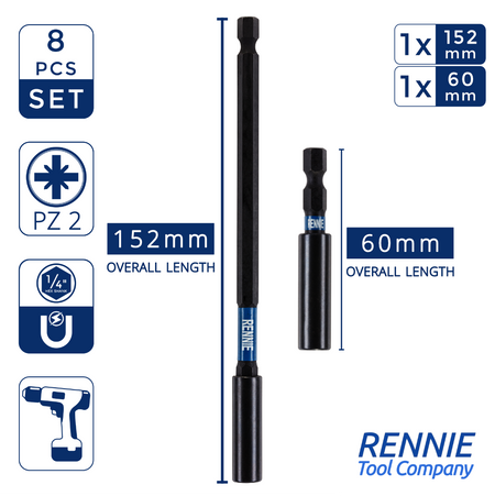 - 8 piece Rennie Tool Company magnetic impact driver bits set. This impact screwdriver set includes 1 x 60mm long impact bit holder, 1 x 152mm long impact bit holder and 2 x 25mm long PZ2 impact driver bits, 1 x 50mm long PZ2 magnetic impact driver bit, 1 x 75mm long PZ2 impact bit, 1 x 100mm long PZ2 magnetic impact bit and 1 x 150mm extra long magnetic impact bit
