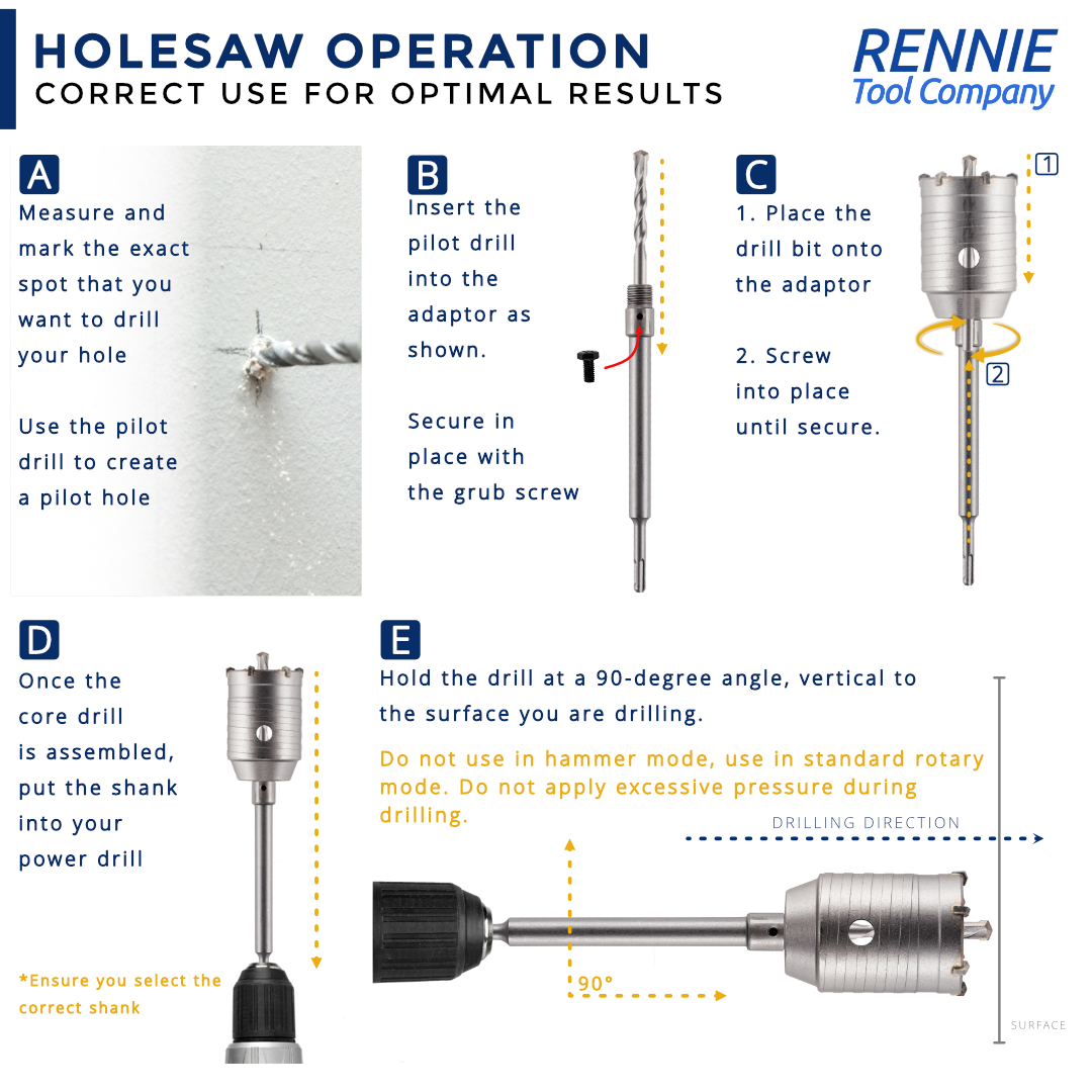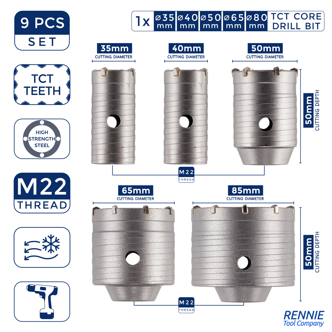 The Rennie Tools 9-Piece TCT Core Drill Bit Set is a comprehensive solution for drilling through tough materials like concrete, brick, cement, and stone.
