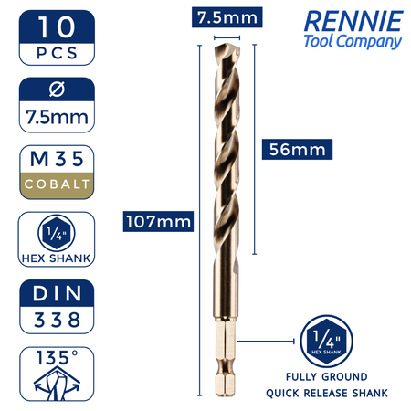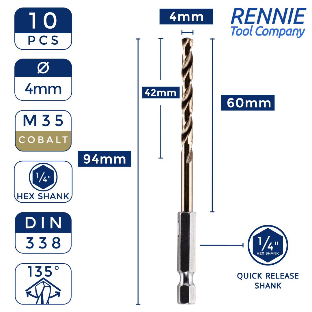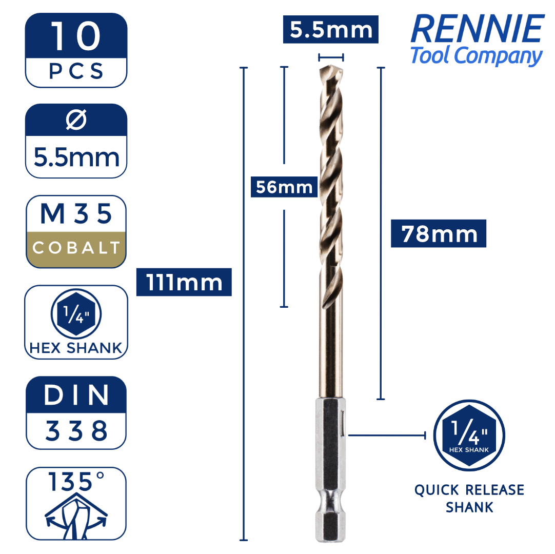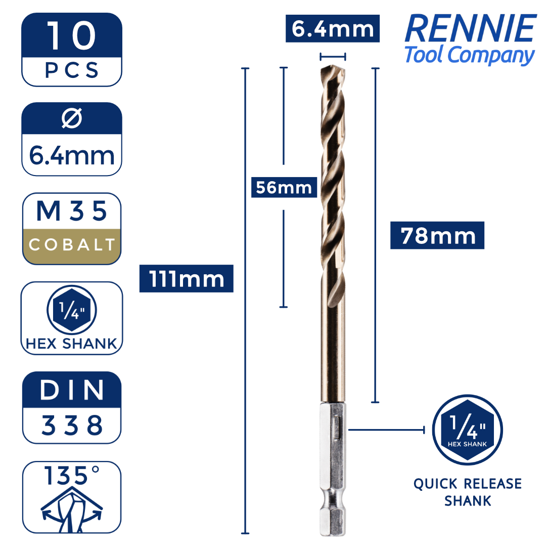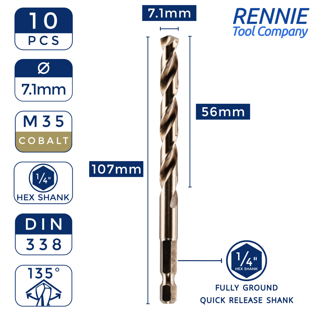 Box Of 10 x Hex Shank Cobalt Jobber Drills For Hard Metals & Stainless Steel