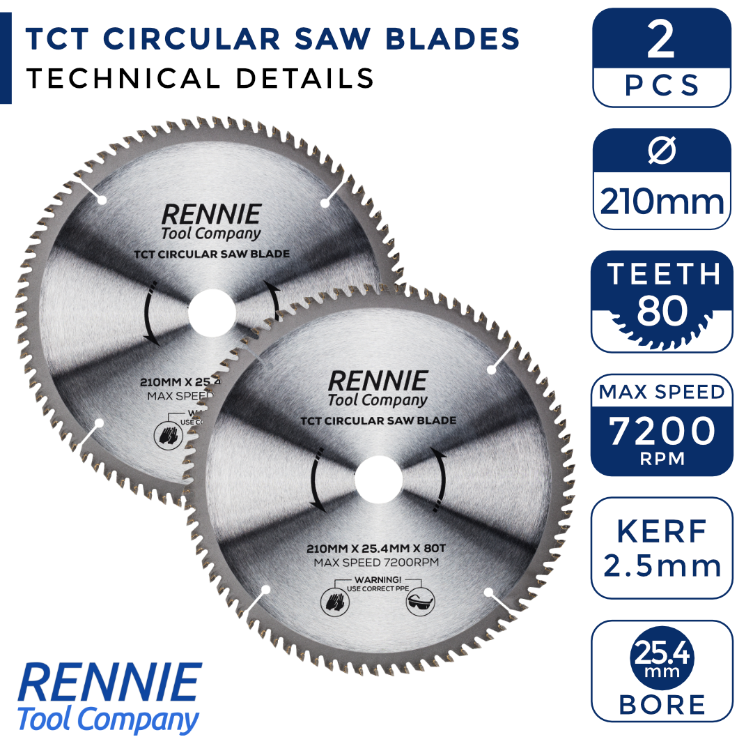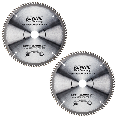 - Pack of 2 x 210mm saw blades 25.4mm bore (1" Bore) - These circular saw blades have 80 teeth and have a 25.4mm bore so will fit any saw that has a 25.4mm bore.