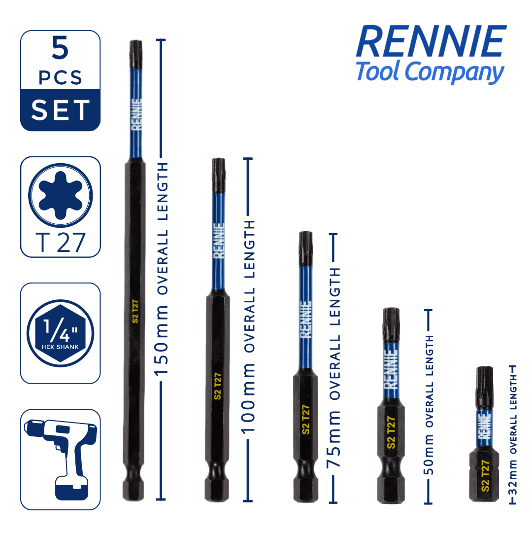 - Set of 5 T27 torx screwdriver bits. This set includes 1 x 32mm T27 torx impact bit, 1 x 50mm long T27 torx bit, 1 x 75mm long T 27 torx bit, 1 x 100mm long T27 torx bit and 1 x 150mm long T7 torx impact bit They are supplied in a plastic storage wallet. These long reach T27 Torx impact driver bits are manufactured using high quality S2 steel and using the latest manufacturing technologies.