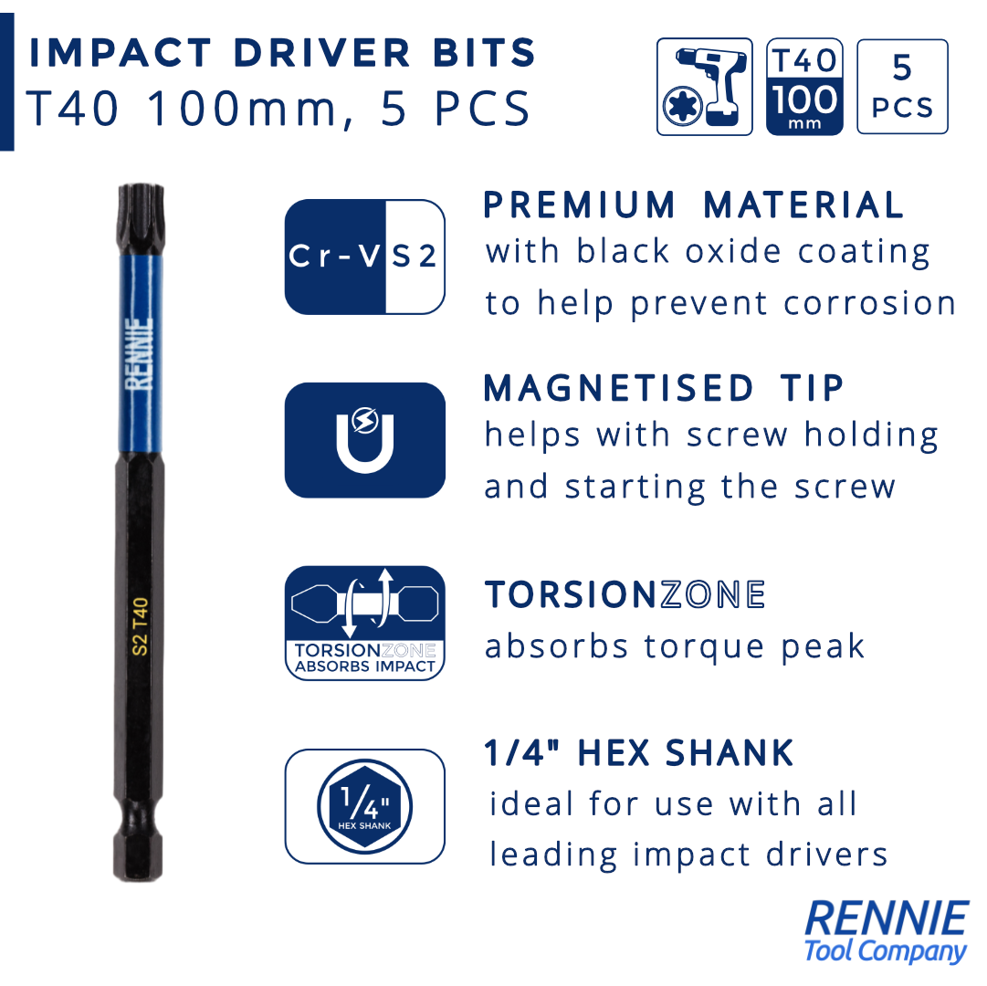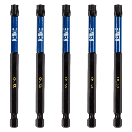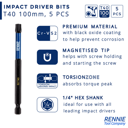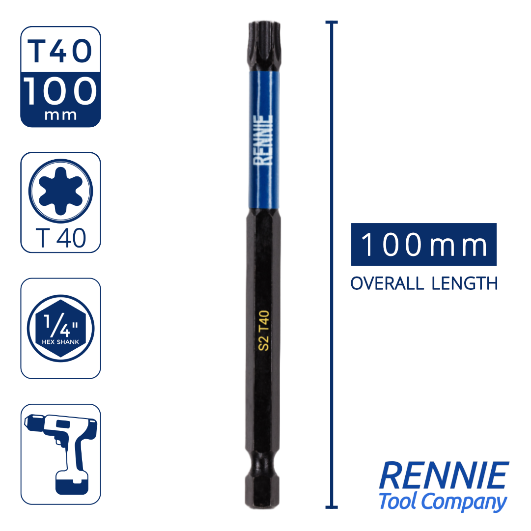 - This T40 torx screwdriver bits set includes 5 x T40 impact bits that are an overall length of 100mm. They are supplied in a plastic storage wallet. These 100mm long reach T40 Torx impact driver bits are manufactured using high quality S2 steel and using the latest manufacturing technologies.