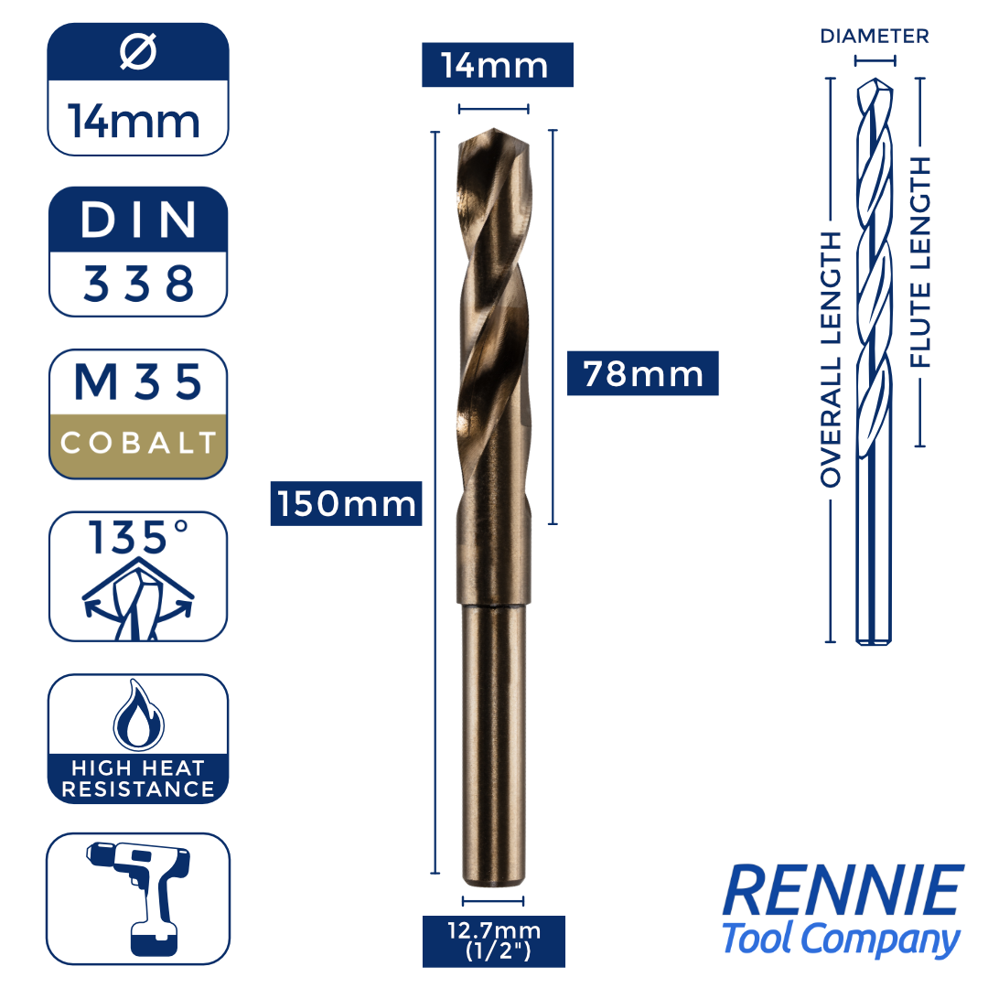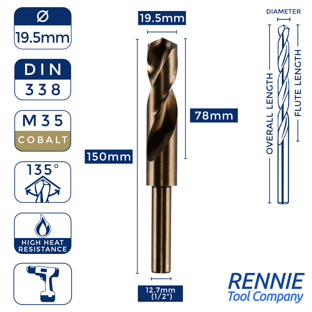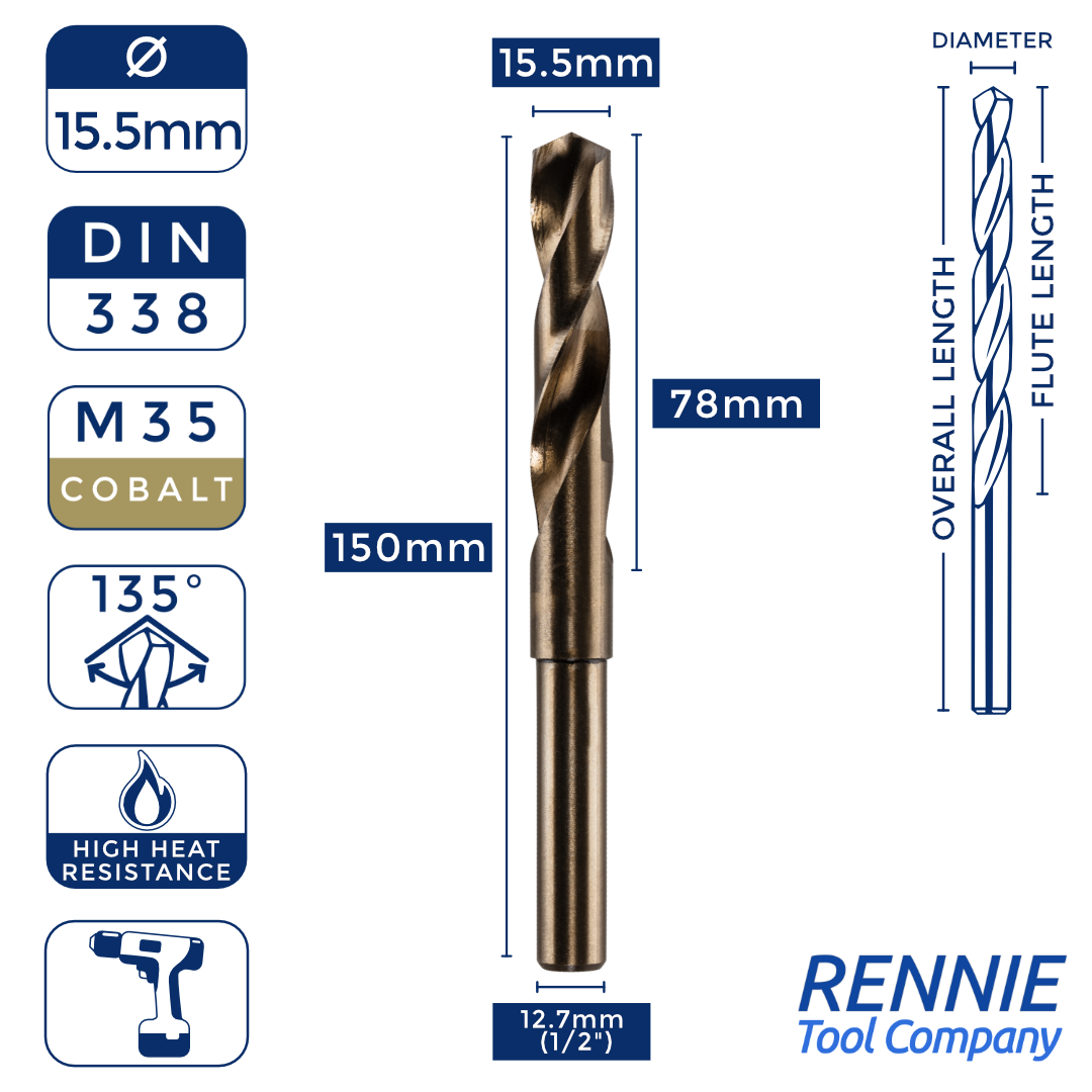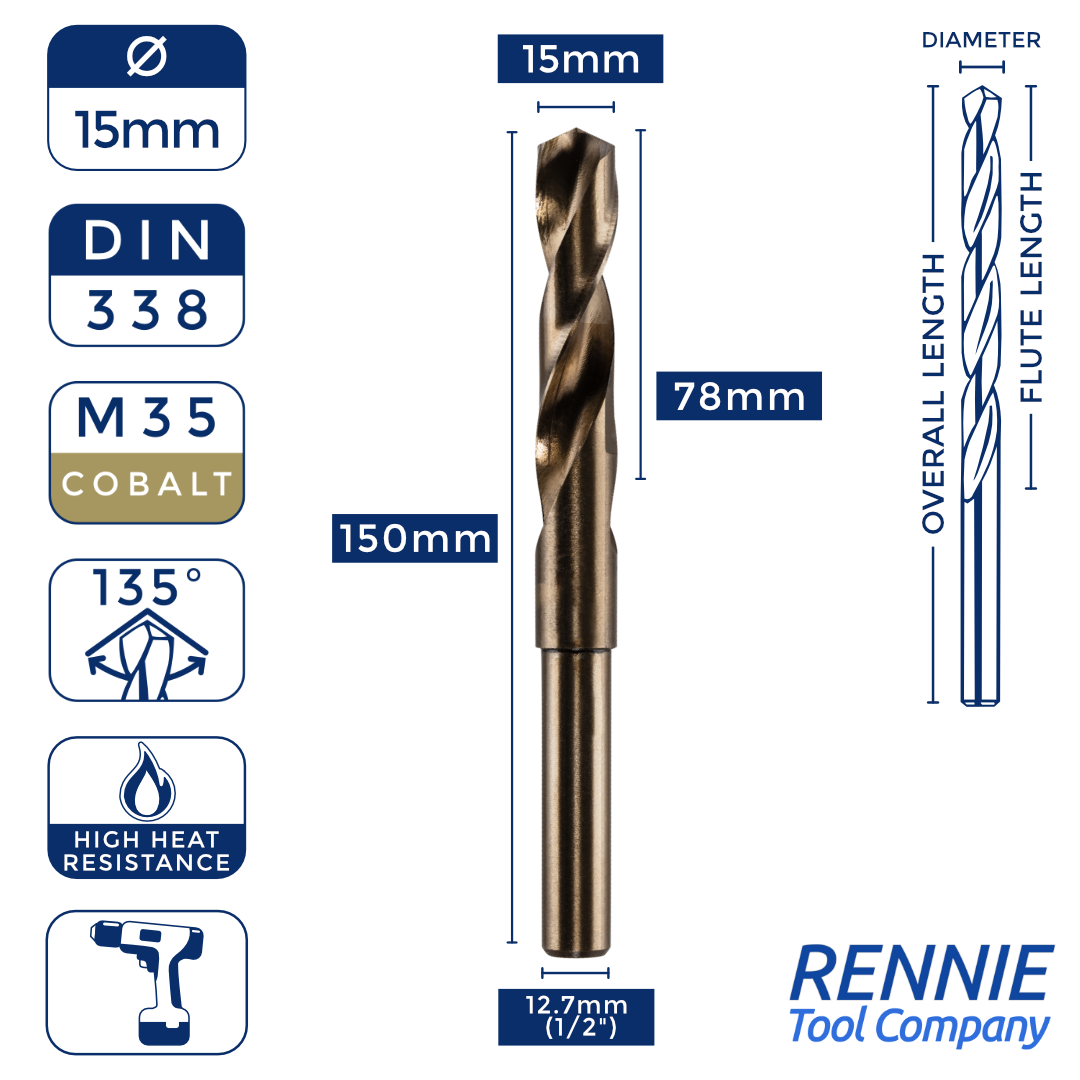 Whether you’re after something smaller than a 20mm HSS drill bit (like a 13.5mm one) or something much larger (like a 40mm one), then Rennie Tool Company has got you covered. Our HSS cobalt blacksmith reduced shank drills are meticulously crafted to meet the stringent standards of DIN338 and BS328, making them ideal for seasoned professionals and DIY enthusiasts alike. These cobalt drills can be used alongside all manner of materials, which is why they’re so indispensable to any toolkit.