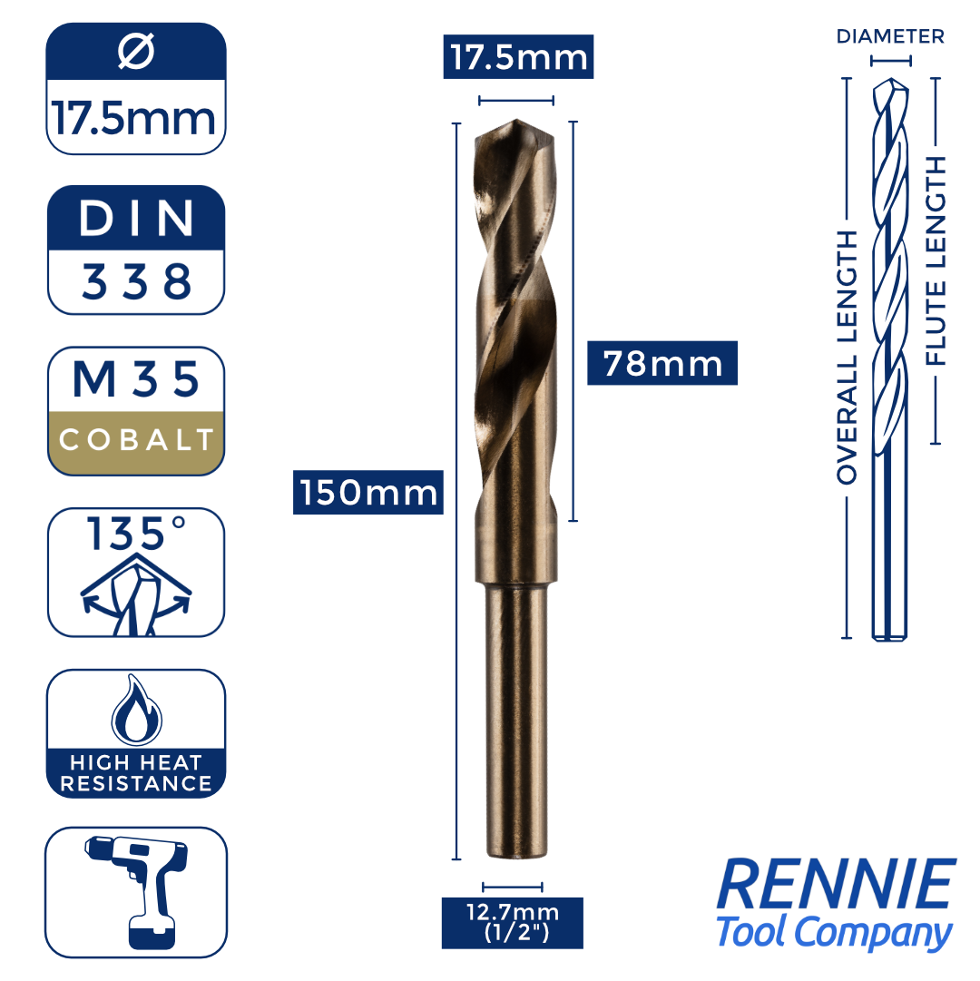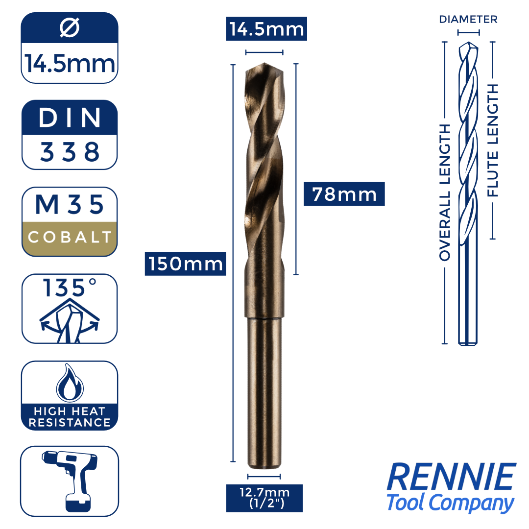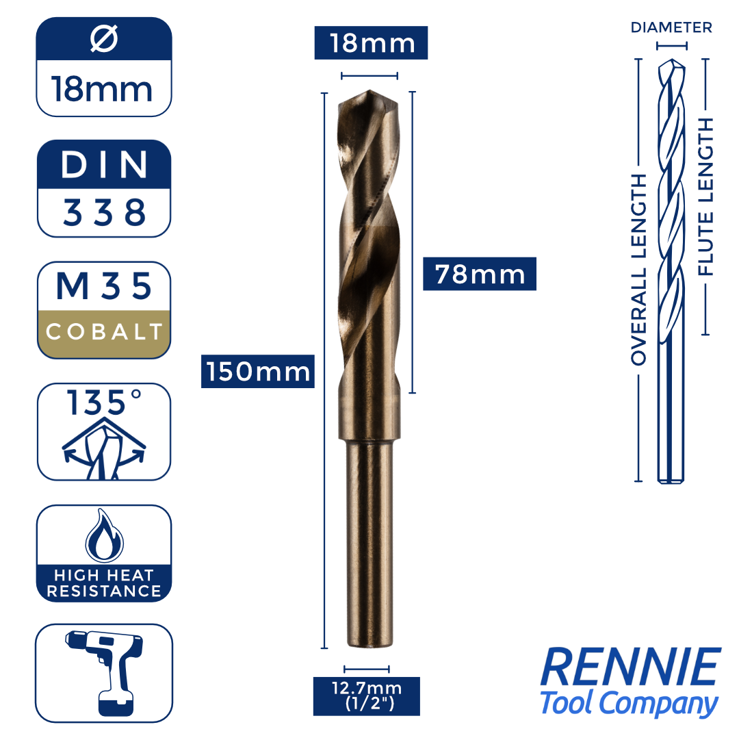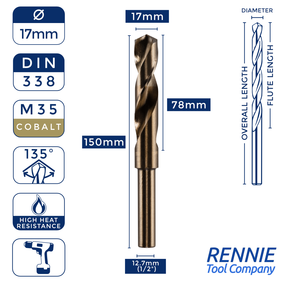 Whether you’re after something smaller than a 20mm HSS drill bit (like a 13.5mm one) or something much larger (like a 40mm one), then Rennie Tool Company has got you covered. Our HSS cobalt blacksmith reduced shank drills are meticulously crafted to meet the stringent standards of DIN338 and BS328, making them ideal for seasoned professionals and DIY enthusiasts alike. These cobalt drills can be used alongside all manner of materials, which is why they’re so indispensable to any toolkit.