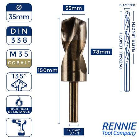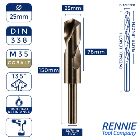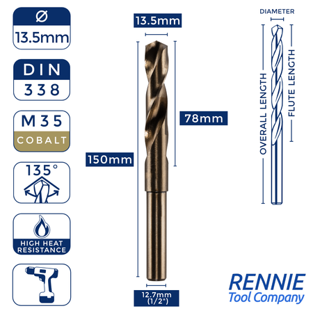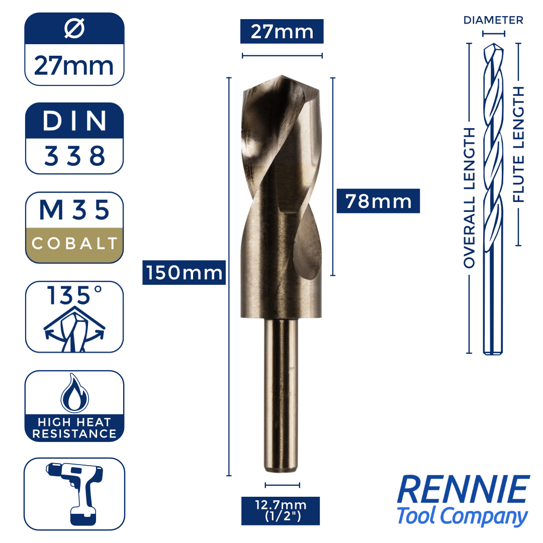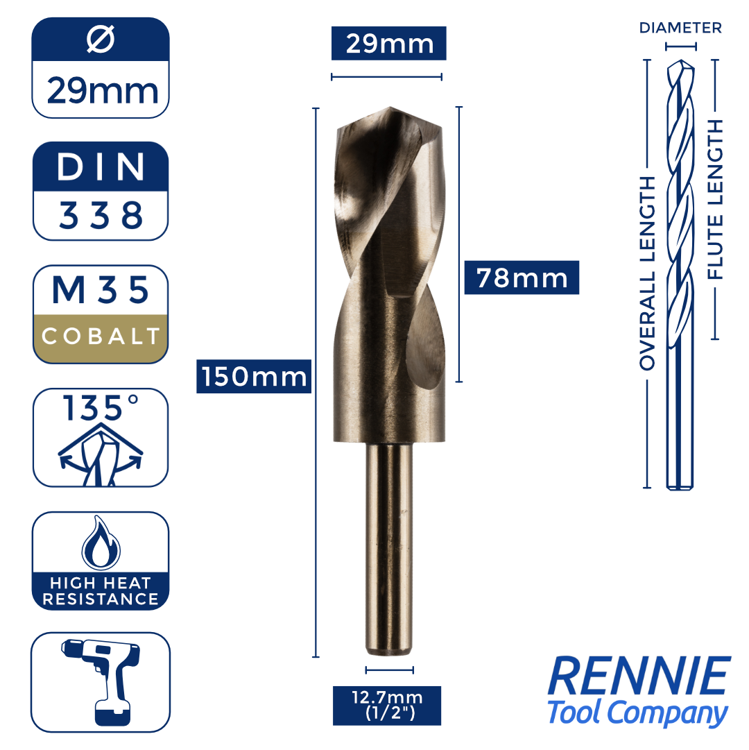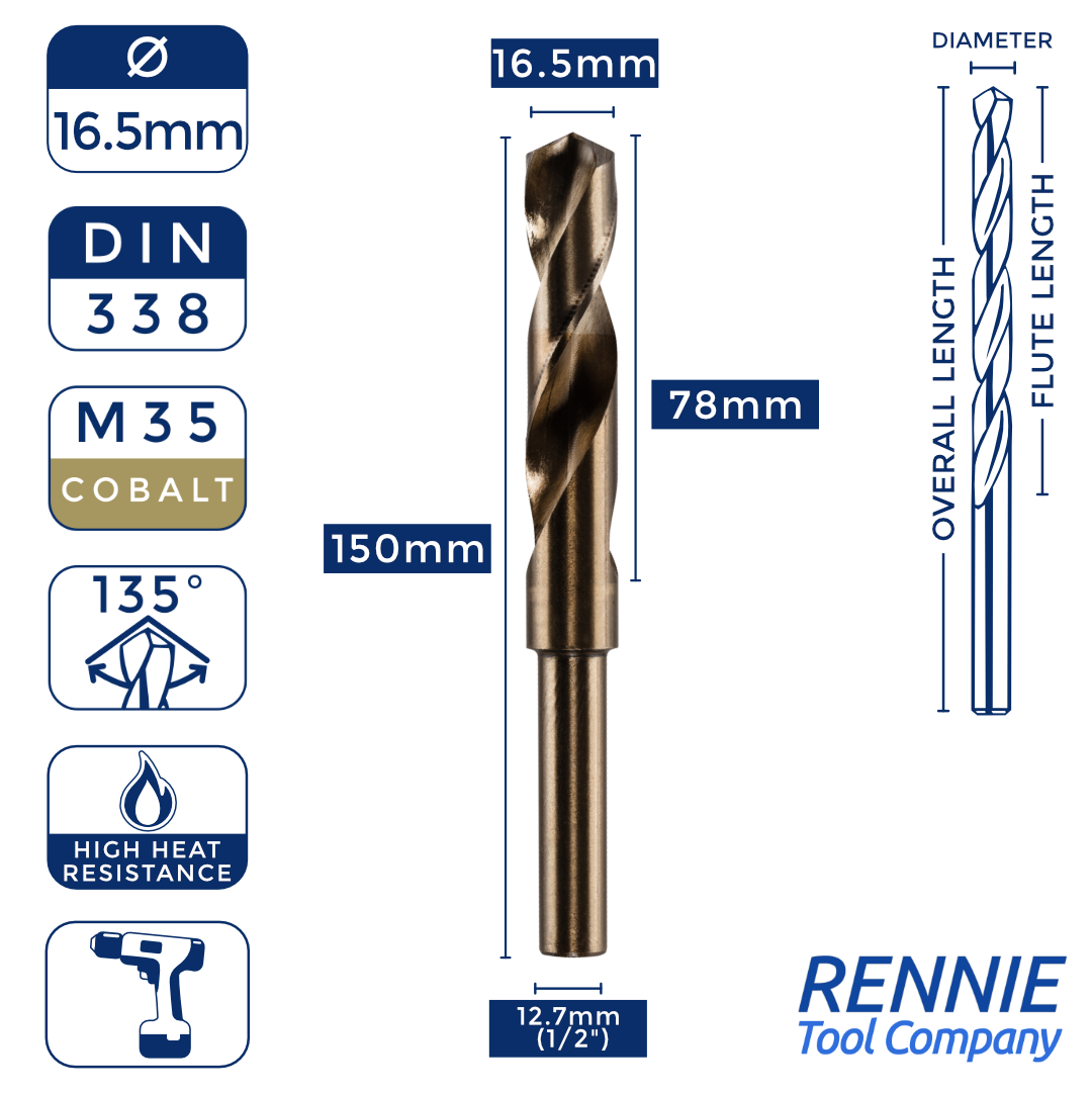 Whether you’re after something smaller than a 20mm HSS drill bit (like a 13.5mm one) or something much larger (like a 40mm one), then Rennie Tool Company has got you covered. Our HSS cobalt blacksmith reduced shank drills are meticulously crafted to meet the stringent standards of DIN338 and BS328, making them ideal for seasoned professionals and DIY enthusiasts alike. These cobalt drills can be used alongside all manner of materials, which is why they’re so indispensable to any toolkit.